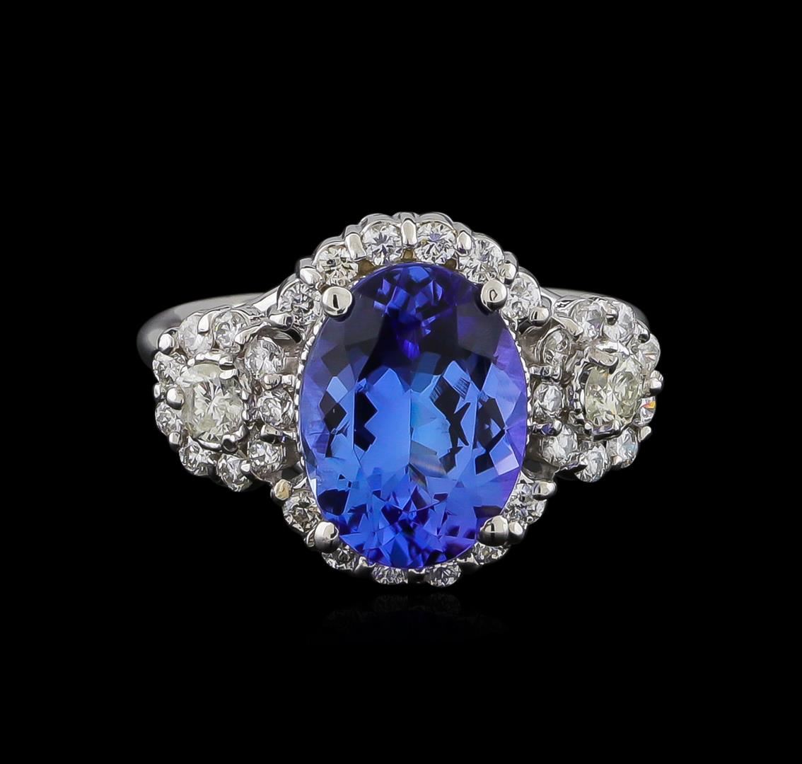 One electronically tested 14KT white gold lady's cast 3-stone halo ring with a cathedral shank with a bright polish finish. The featured lady's ring has a shank measuring 1.90 millimeters wide. Condition is new, good workmanship. Containing: One prong set oval modified brilliant cut natural tanzanite, measuring 11.94 x 8.88 x 5.78mm, approximate weight of 4.25ct., clarity is eye clean, type I, medium, very slightly grayish, bluish violet color, (GIA bV 5/3), cut is very good. Transmitting light with no distortion, transparent. Colored gemstones are presumed to have been subjected to commonly used enhancement processes. Graded in the setting. Two prong set round brilliant cut diamonds, measuring 3.10 - 3.00 x 1.89mm (depth est.) approximate total weight of 2 Stones = 0.22ct. Graded in the setting. Clarity: I-1. Color: H - I. Cut Good Thirty prong set round brilliant cut diamonds, measuring 1.75 - 1.65 x 1.04mm (depth est.) approximate total weight of 30 Stones = 0.55ct. Graded in the setting. Clarity: SI-1 to SI-2. Color: H - I. Cut Good. Total Weight of Colored Stones 4.25ct. Total Weight of Diamonds 0.77ct. Total Weight of Ring 6.60gm. GAS Appraised at $9,110.00.