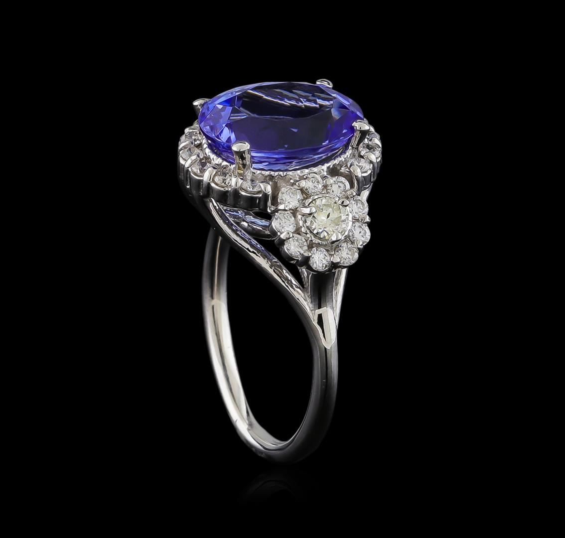 One electronically tested 14KT white gold lady's cast 3-stone halo ring with a cathedral shank with a bright polish finish. The featured lady's ring has a shank measuring 1.90 millimeters wide. Condition is new, good workmanship. Containing: One prong set oval modified brilliant cut natural tanzanite, measuring 11.94 x 8.88 x 5.78mm, approximate weight of 4.25ct., clarity is eye clean, type I, medium, very slightly grayish, bluish violet color, (GIA bV 5/3), cut is very good. Transmitting light with no distortion, transparent. Colored gemstones are presumed to have been subjected to commonly used enhancement processes. Graded in the setting. Two prong set round brilliant cut diamonds, measuring 3.10 - 3.00 x 1.89mm (depth est.) approximate total weight of 2 Stones = 0.22ct. Graded in the setting. Clarity: I-1. Color: H - I. Cut Good Thirty prong set round brilliant cut diamonds, measuring 1.75 - 1.65 x 1.04mm (depth est.) approximate total weight of 30 Stones = 0.55ct. Graded in the setting. Clarity: SI-1 to SI-2. Color: H - I. Cut Good. Total Weight of Colored Stones 4.25ct. Total Weight of Diamonds 0.77ct. Total Weight of Ring 6.60gm. GAS Appraised at $9,110.00.