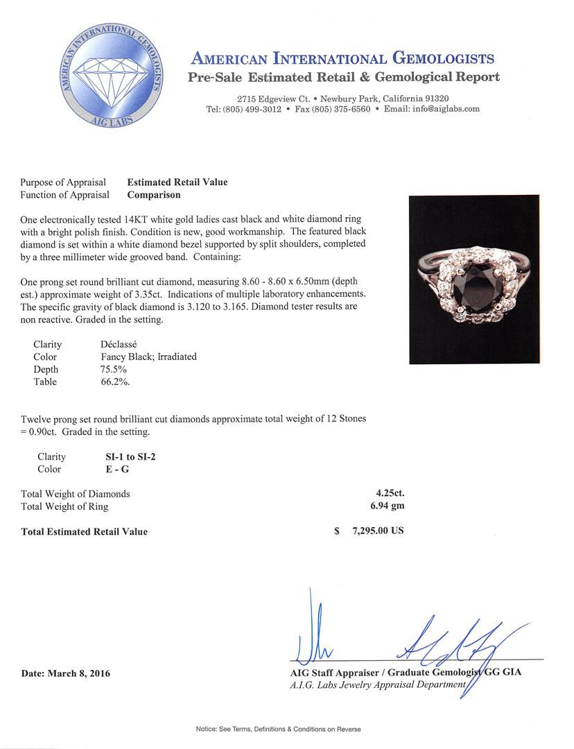 One electronically tested 14KT white gold ladies cast black and white diamond ring with a bright polish finish. The featured black diamond is set within a white diamond bezel supported by split shoulders, completed by a three millimeter wide grooved band. Condition is new, good workmanship. Containing: One prong set round brilliant cut diamond, measuring 8.60 - 8.60 x 6.50mm (depth est.) approximate weight of 3.35ct. Indications of multiple laboratory enhancements. The specific gravity of black diamond is 3.120 to 3.165. Diamond tester results are non reactive. Graded in the setting. Clarity Déclassé‚. Color: Fancy Black; Irradiated. Depth: 75.5%. Table: 66.2%. Twelve prong set round brilliant cut diamonds approximate total weight of 12 Stones = 0.90ct. Graded in the setting. Clarity: SI-1 to SI-2. Color: E - G. Total Weight of Diamonds 4.25ct. Total Weight of Ring 6.94gm. AIG Appraised at $7,295.00.