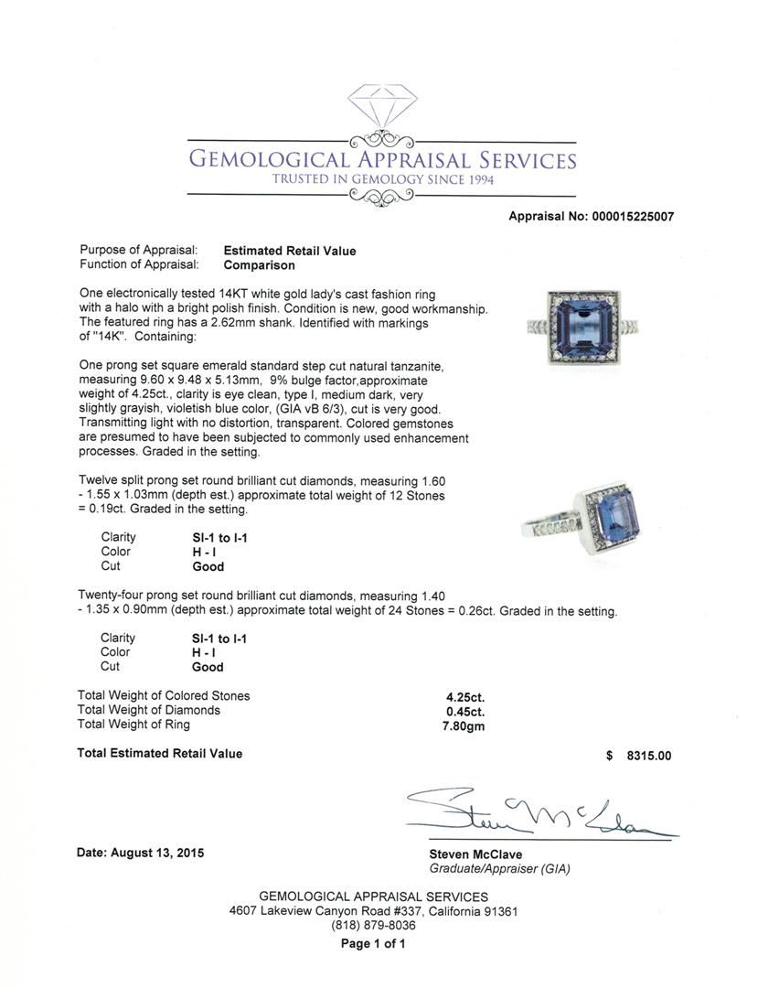 One electronically tested 14KT white gold lady's cast fashion ring with a halo with a bright polish finish. The featured ring has a 2.62mm shank. Identified with markings of "14K". Condition is new, good workmanship. Containing: One prong set square emera GAS Appraised at $8,315.00.