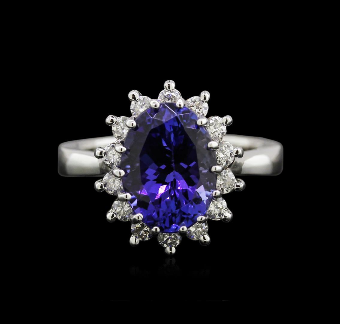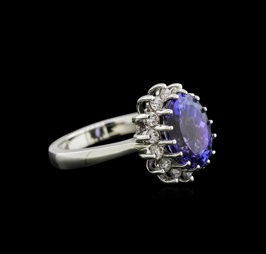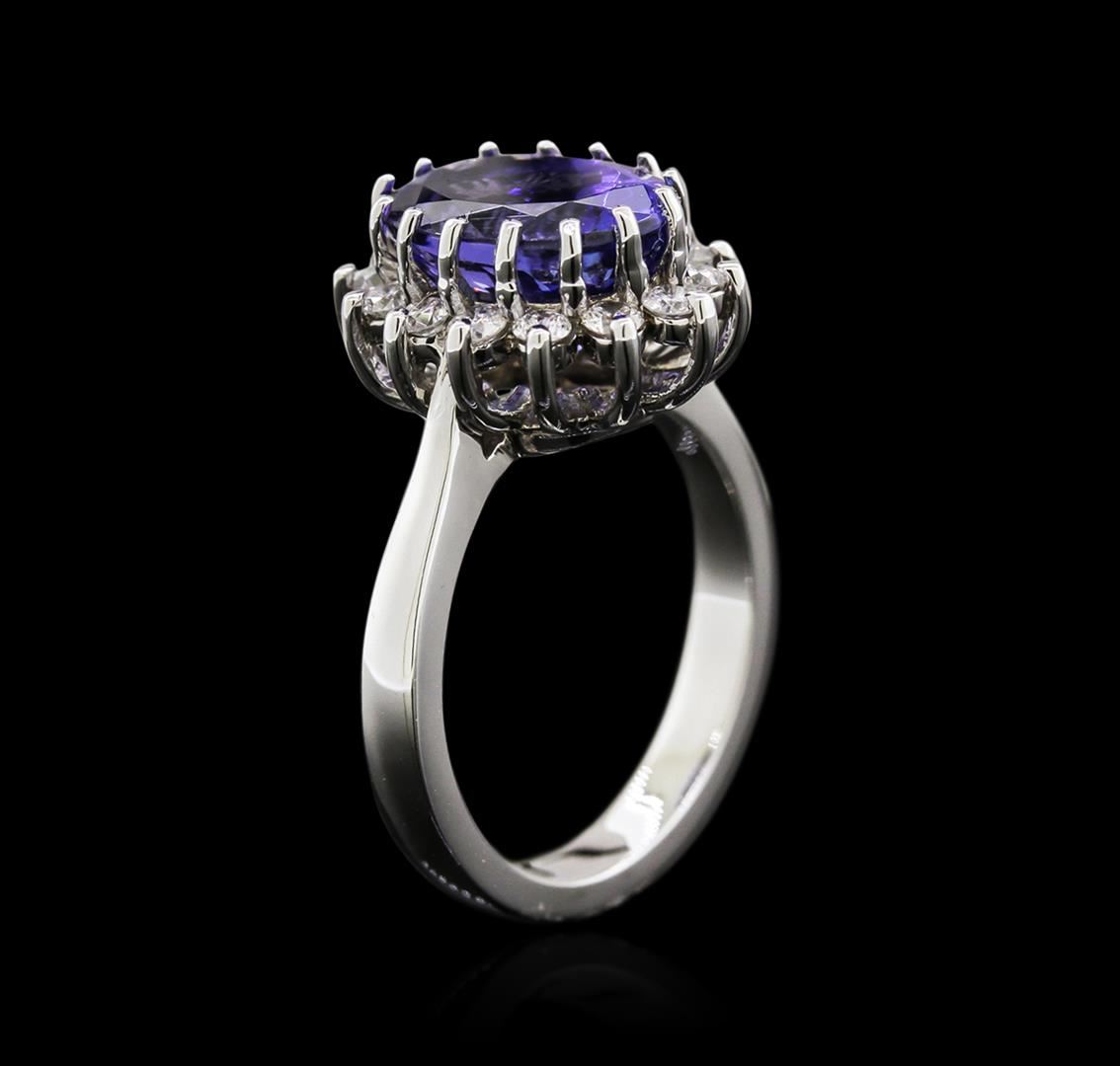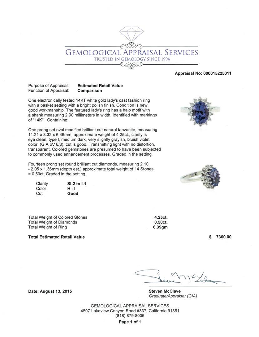 One electronically tested 14KT white gold lady's cast fashion ring with a basket setting with a bright polish finish. The featured lady's ring has a halo motif with a shank measuring 2.90 millimeters in width. Identified with markings of "14K". Condition is new, good workmanship. Containing: One prong set oval modified brilliant cut natural tanzanite, measuring 11.21 x 8.32 x 6.46mm, approximate weight of 4.25ct., clarity is eye clean, type I, medium dark, very slightly grayish, bluish violet color, (GIA bV 6/3), cut is good. Transmitting light with no distortion, transparent. Colored gemstones are presumed to have been subjected to commonly used enhancement processes. Graded in the setting. Fourteen prong set round brilliant cut diamonds, measuring 2.10 - 2.05 x 1.36mm (depth est.) approximate total weight of 14 Stones = 0.50ct. Graded in the setting. Clarity: SI-2 to I-1. Color: H - I. Cut Good. Total Weight of Colored Stones 4.25ct. Total Weight of Diamonds 0.50ct. Total Weight of Ring 6.39gm. GAS Appraised at $7,360.00.