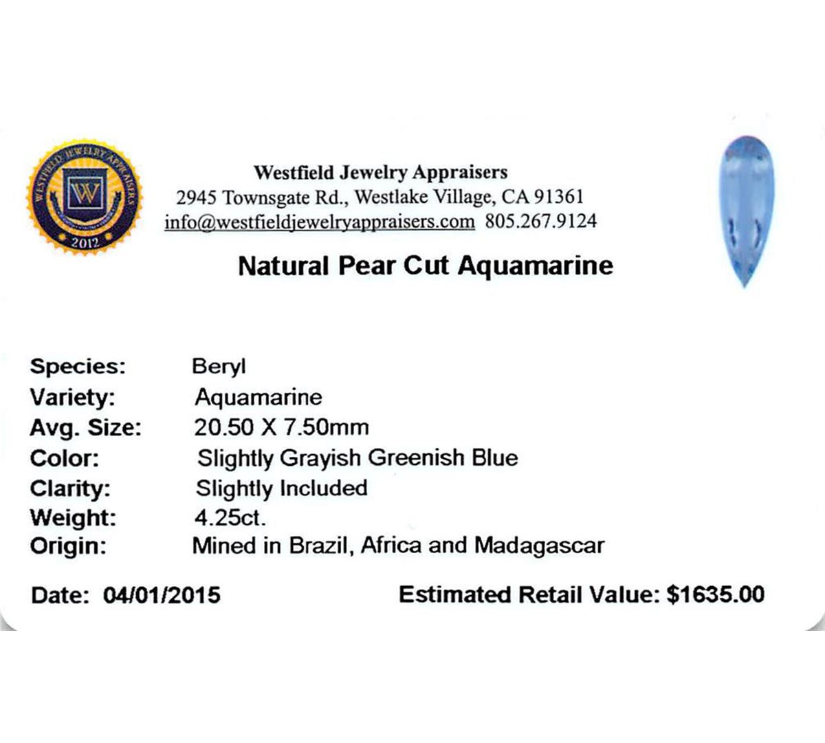 One pear cut natural aquamarine exact weight 4.25ct., clarity is slightly included, type I, medium, very slightly grayish, very slightly greenish blue color, (GIA vslgB 5/3), cut is good. Westfield Appraised at $1,635.00.