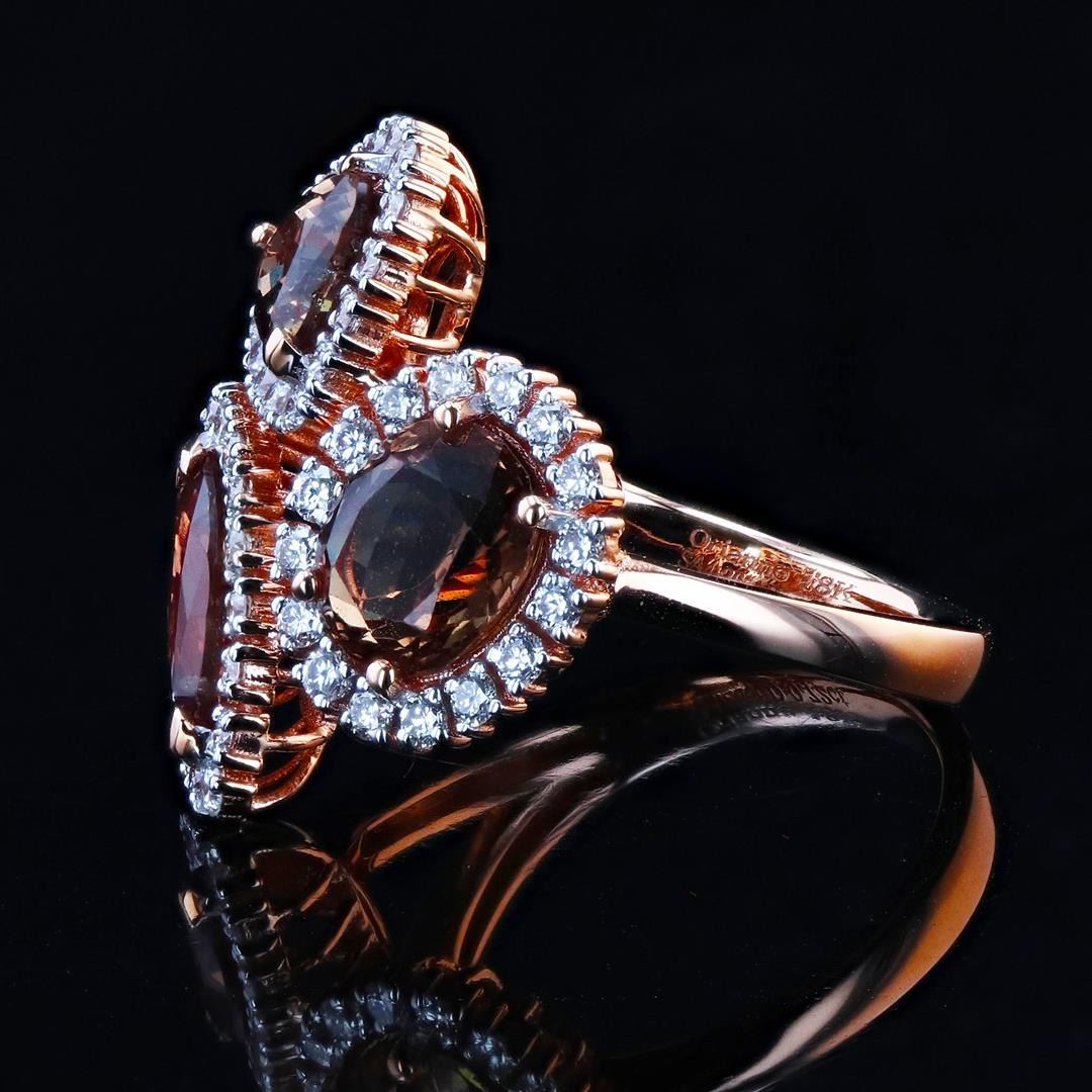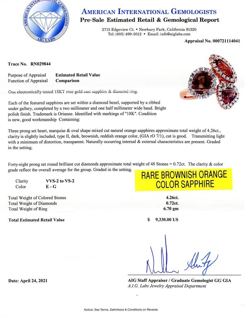 One electronically tested 18KT rose gold cast sapphire & diamond ring. Each of the featured sapphires are set within a diamond bezel, supported by a ribbed under gallery, completed by a two millimeter and one half millimeter wide band. Bright polish finis