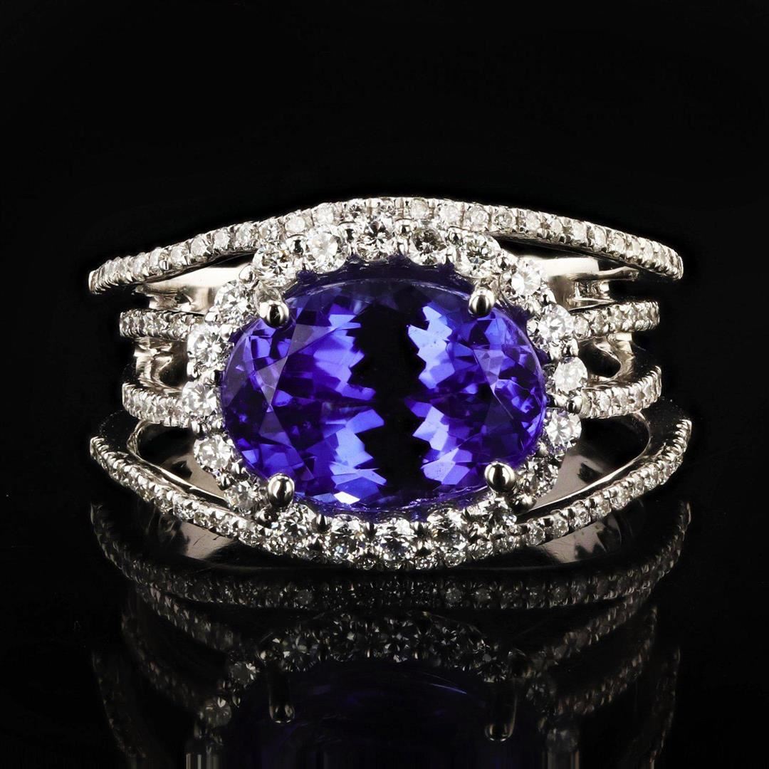 One electronically tested platinum ladies cast & assembled tanzanite & diamond ring. Condition is new, good workmanship. The featured tanzanite is set within a diamond bezel, supported by a series of diamond ribbons, completed by a five millimeter wide band. Trademark is Orianne. Identified with markings of "PT950". One prong set oval mixed cut natural tanzanite, measuring 11.55 x 8.38 x 5.78mm, approximate weight of 4.26ct., clarity is eye clean, type I, medium dark, moderately strong, violetish blue color, (GIA vB 6/4), cut is good. Transmitting light with no distortion, transparent. Graded in the setting. Tanzanite is a very rare gemstone that is only found in the country of Tanzania. Originally discovered in 1967. Tiffany & Company named the stone Tanzanite. It is found in the Usumburu Mountains that border the Umba Valley of northern Tanzania. Tanzanite occurs in gray, brown, violet, blue, reddish-purple, & green. The gem is interesting because of its exceptional pleochroism. Rotated in different directions a tanzanite will exhibit multiple changes of color. Tanzanite has a low tolerance to ultrasonic cleaning, and should not be cleaned using this method. One hundred twenty prong set round brilliant cut diamonds approximate total weight of 120 Stones = 0.84ct. Graded in the setting. Clarity VS-2 to I-1 Color F - H