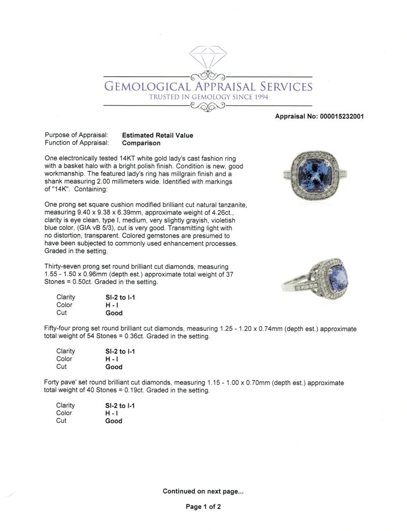 One electronically tested 14KT white gold lady's cast fashion ring with a basket halo with a bright polish finish. The featured lady's ring has milgrain finish and a shank measuring 2.00 millimeters wide. Identified with markings of "14K". Condition is new, good workmanship. Containing: One prong set square cushion modified brilliant cut natural tanzanite, measuring 9.40 x 9.38 x 6.39mm, approximate weight of 4.26ct., clarity is eye clean, type I, medium, very slightly grayish, violetish blue color, (GIA vB 5/3), cut is very good. Transmitting light with no distortion, transparent. Colored gemstones are presumed to have been subjected to commonly used enhancement processes. Graded in the setting. Thirty-Seven prong set round brilliant cut diamonds, measuring 1.55 - 1.50 x 0.96mm (depth est.) approximate total weight of 37 Stones = 0.50ct. Graded in the setting. Clarity: SI-2 to I-1. Color: H - I. Cut Good Fifty-Four prong set round brilliant cut diamonds, measuring 1.25 - 1.20 x 0.74mm (depth est.) approximate total weight of 54 Stones = 0.36ct. Graded in the setting. Clarity: SI-2 to I-1. Color: H - I. Cut Good Forty pave' set round brilliant cut diamonds, measuring 1.15 - 1.00 x 0.70mm (depth est.) approximate total weight of 40 Stones = 0.19ct. Graded in the setting. Clarity: SI-2 to I-1. Color: H - I. Cut Good. Total Weight of Colored Stones 4.26ct. Total Weight of Diamonds 1.05ct. Total Weight of Ring 6.90gm. GAS Appraised at $9,465.00.
