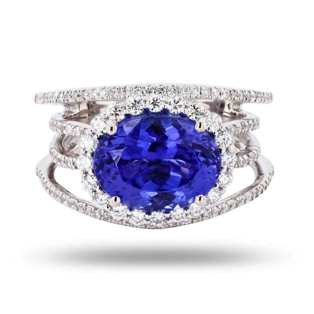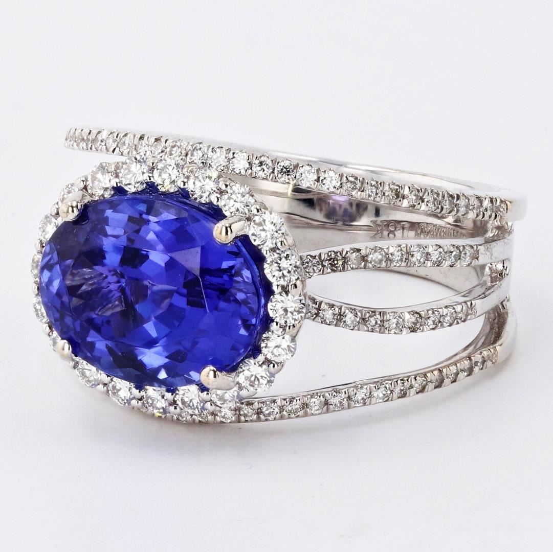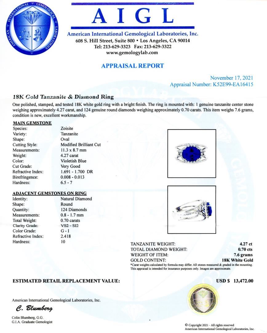One polished, stamped, and tested 18K white gold ring with a bright finish. The ring is mounted with: 1 genuine tanzanite center stone weighing approximately 4.27 carat, and 124 genuine round diamonds weighing approximately 0.70 carats. This item weighs 7.6 grams, condition is new, excellent workmanship. MAIN GEMSTONE Species: Zoisite Variety: Tanzanite Shape: Oval Cutting Style: Modified Brilliant Cut Measurements: 11.3 x 8.7mm Weight: 4.27 carat Color: Violetish Blue Cut Grade: Very Good Refractive Index: 1.691 - 1.700 DR Birefringence: 0.008 - 0.013 Hardness: 6.5 - 7 ADJACENT GEMSTONES ON RING Identity: Natural Diamond Shape: Round Quantity: 124 Diamonds Measurements: 0.8 - 1.7mm Total Weight: 0.70 carats Clarity Grade: VS2 to SI2 Color Grade: G - I Refractive Index: 2.418 Hardness: 10 TANZANITE WEIGHT: 4.27ct TOTAL DIAMOND WEIGHT: 0.70ctw WEIGHT OF ITEM: 7.6 grams GOLD CONTENT: 18K White Gold Size: 6 1/4