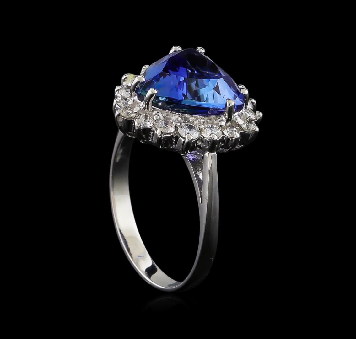 One electronically tested 14KT white gold lady's cast fashion ring with a basket halo with a bright polish finish. The featured lady's ring has a shank measuring 2.37 millimeters wide. Identified with markings of "K14". Condition is new, good workmanship. Containing: One prong set triangle modified brilliant cut natural tanzanite, measuring 11.14 x 10.85 x 6.18mm, approximate weight of 4.27ct., clarity is eye clean, type I, medium dark, very slightly grayish, violetish blue color, (GIA vB 6/3), cut is very good. Transmitting light with no distortion, transparent. Colored gemstones are presumed to have been subjected to commonly used enhancement processes. Graded in the setting. Eighteen prong set round brilliant cut diamonds, measuring 2.30 - 1.80 x 1.27mm (depth est.) approximate total weight of 18 Stones = 0.60ct. Graded in the setting. Clarity: SI-1 to I-1. Color: G - Good. Total Weight of Colored Stones 4.27ct. Total Weight of Diamonds 0.60ct. Total Weight of Ring 5.00gm. GAS Appraised at $9,005.00.