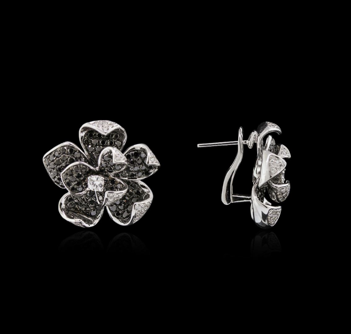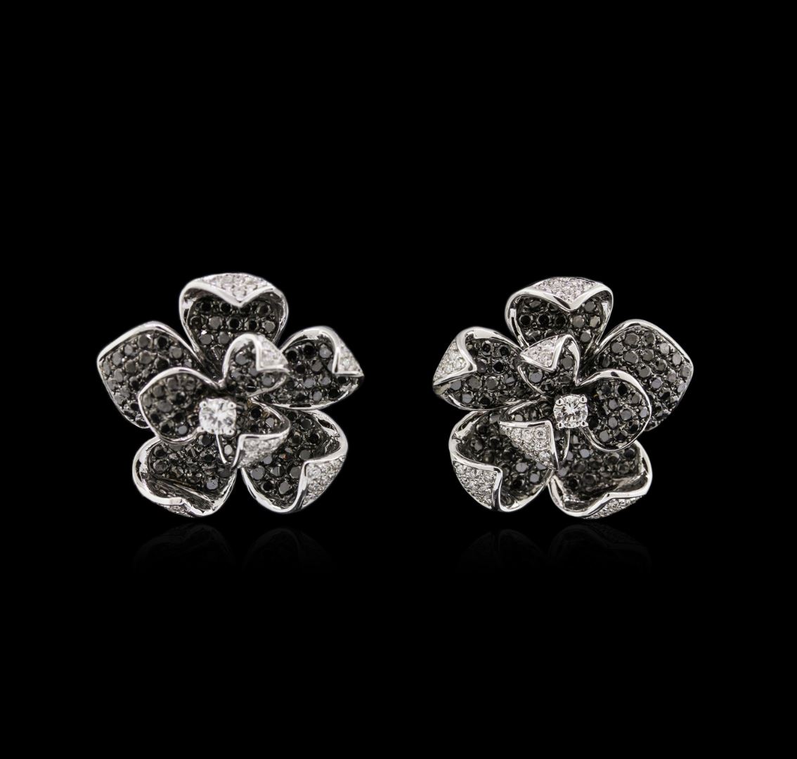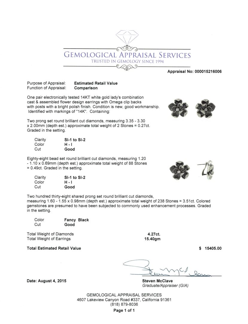 One pair electronically tested 14KT white gold lady's combination cast & assembled flower design earring with Omega clip backs with posts with a bright polish finish. Identified with markings of "14K". Condition is new, good workmanship. Containing: Two prong set round brilliant cut diamonds, measuring 3.35 - 3.30 x 2.00mm (depth est.) approximate total weight of 2 Stones = 0.27ct. Graded in the setting. Clarity SI-1 to SI-2 Color H - I. Cut Good Eighty-Eight bead set round brilliant cut diamonds, measuring 1.20 - 1.10 x 0.69mm (depth est.) approximate total weight of 88 Stones = 0.49ct. Graded in the setting. Clarity SI-1 to SI-2 Color H - I. Cut Good Two Hundred Thirty-Eight shared prong set round brilliant cut diamonds, measuring 1.60 - 1.55 x 0.98mm (depth est.) approximate total weight of 238 Stones = 3.51ct. Colored gemstones are presumed to have been subjected to commonly used enhancement processes. Graded in the setting. Cut Good Total Weight of Diamonds 4.27ct. Total Weight of Earring 15.40gm GAS Appraised at $15,405.00.