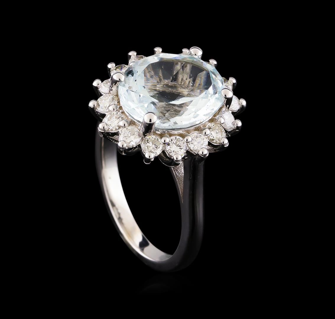 One electronically tested 14KT white gold lady's cast fashion ring with a basket halo with a bright polish finish. The featured lady's ring has a shank measuring 2.18 millimeters wide. Identified with markings of "14K". Condition is new, good workmanship. Containing: One prong set oval modified brilliant cut natural aquamarine, measuring 11.98 x 10.02 x 6.38mm, approximate weight of 4.28ct., clarity is slightly included, light, moderately strong, greenish blue color, (GIA gB 3/4), cut is good. Transmitting light with a minimum of distortion, transparent. Colored gemstones are presumed to have been subjected to commonly used enhancement processes. Graded in the setting. Sixteen prong set round brilliant cut diamonds, measuring 2.40 - 2.35 x 1.48mm (depth est.) approximate total weight of 16 Stones = 0.82ct. Graded in the setting. Clarity: SI-1 to SI-2. Color: H - I. Cut Good. Total Weight of Colored Stones 4.28ct. Total Weight of Diamonds 0.82ct. Total Weight of Ring 6.20gm. GAS Appraised at $7,910.00.