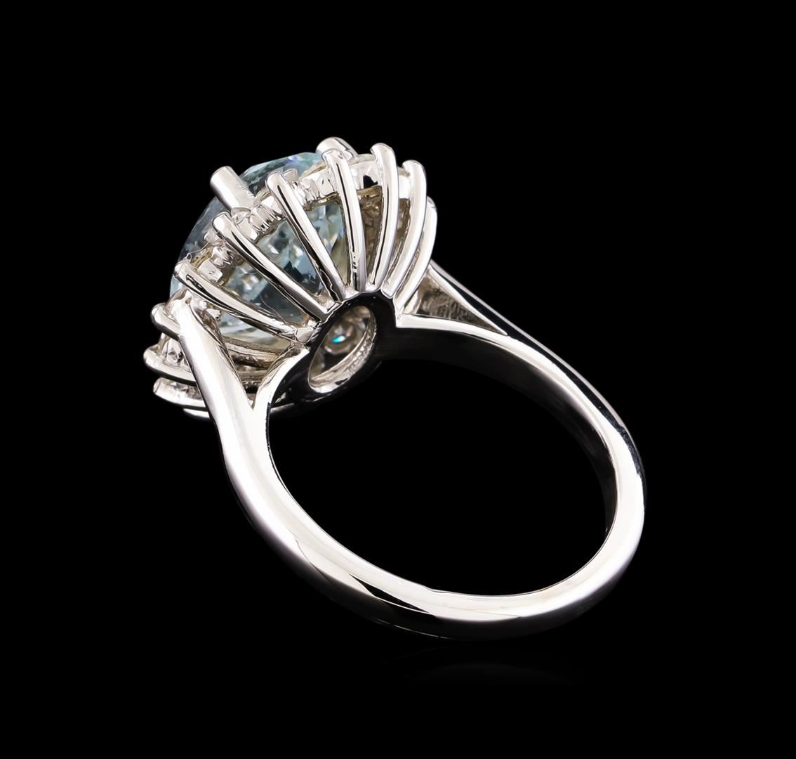 One electronically tested 14KT white gold lady's cast fashion ring with a basket halo with a bright polish finish. The featured lady's ring has a shank measuring 2.18 millimeters wide. Identified with markings of "14K". Condition is new, good workmanship. Containing: One prong set oval modified brilliant cut natural aquamarine, measuring 11.98 x 10.02 x 6.38mm, approximate weight of 4.28ct., clarity is slightly included, light, moderately strong, greenish blue color, (GIA gB 3/4), cut is good. Transmitting light with a minimum of distortion, transparent. Colored gemstones are presumed to have been subjected to commonly used enhancement processes. Graded in the setting. Sixteen prong set round brilliant cut diamonds, measuring 2.40 - 2.35 x 1.48mm (depth est.) approximate total weight of 16 Stones = 0.82ct. Graded in the setting. Clarity: SI-1 to SI-2. Color: H - I. Cut Good. Total Weight of Colored Stones 4.28ct. Total Weight of Diamonds 0.82ct. Total Weight of Ring 6.20gm. GAS Appraised at $7,910.00.