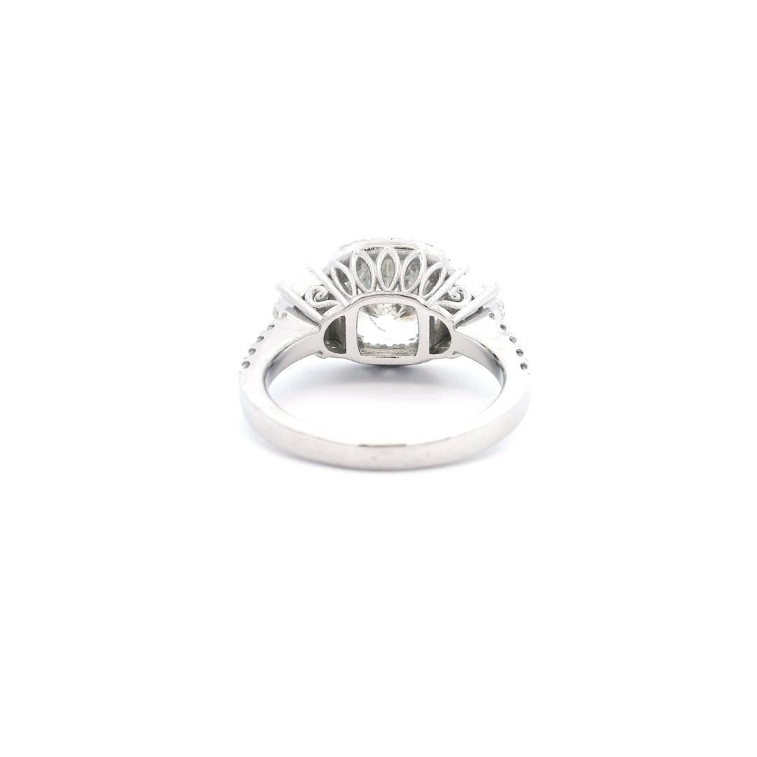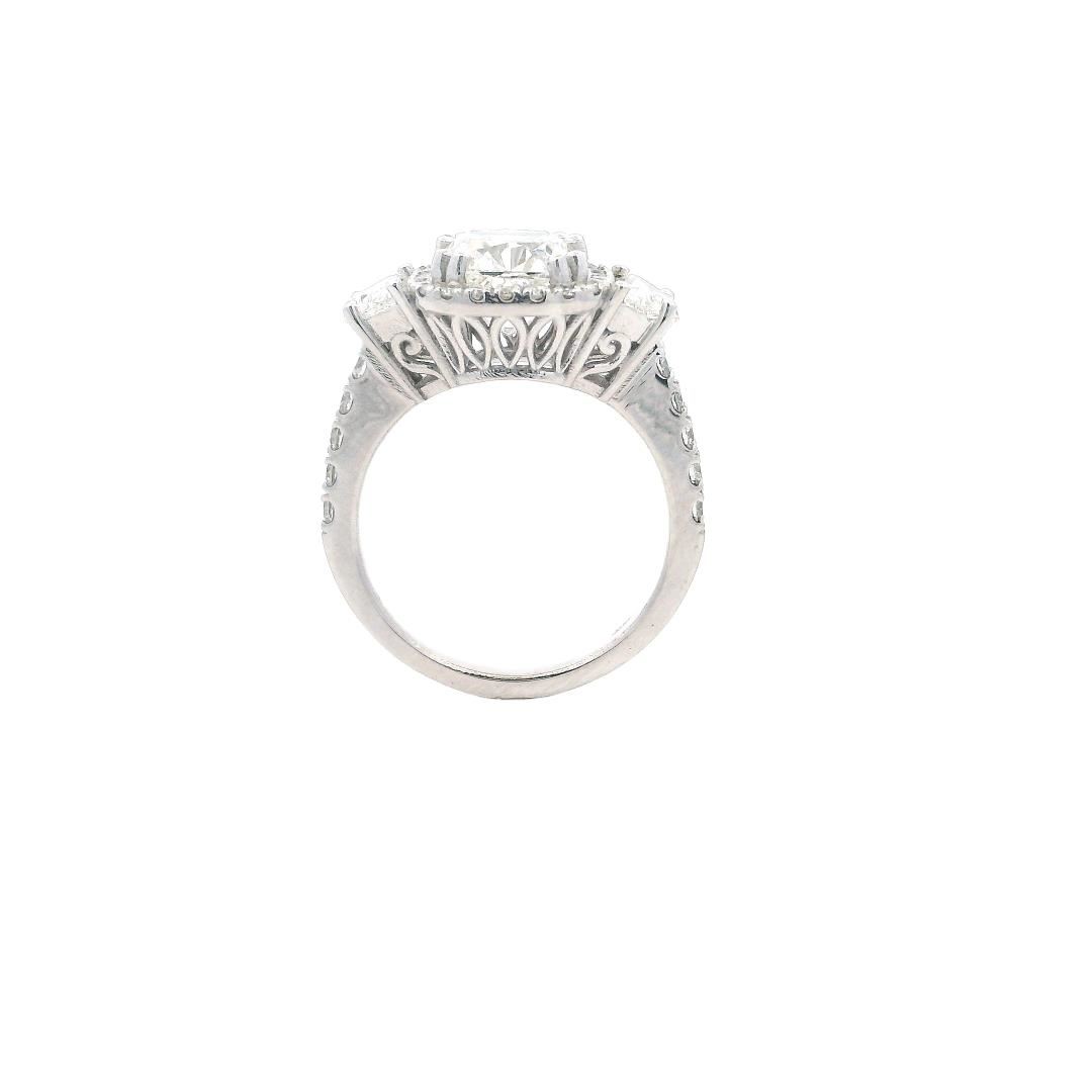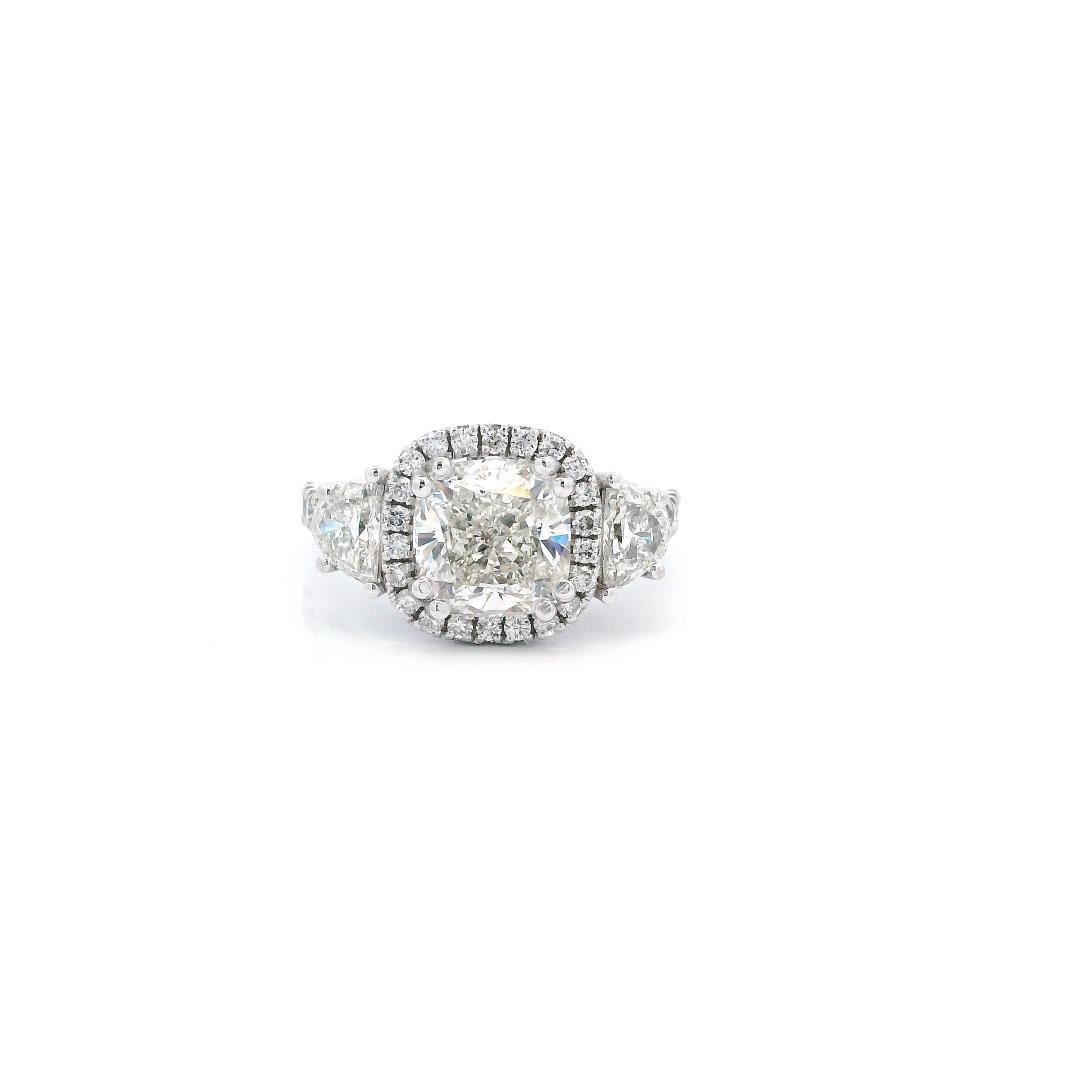 One electronically tested 14KT white gold lady's custom CAD/CAM fashion three stone ring with a cathedral basket halo with a bright polish finish. Condition is new, good workmanship. The featured lady's ring has a shank measuring 2.30 millimeters in width. Identified with markings of "14K". Containing: One prong set cushion cut diamond, measuring 7.94 x 7.81 x 5.55mm (depth est.), 5.00% GTCF approximate weight of 3.01ct. Clarity of VS-2, color of G, cut is excellent. EGL USA Laboratory Report # US 913531801D.. Two prong set half moon cut diamonds, measuring 6.00 x 3.80 x 0.00mm (depth est.) approximate total weight of 2 Stones = 0.72ct. Clarity of VS-1, color of F - G, cut is excellent. Graded in the setting. Ten prong set round brilliant cut diamonds, measuring 2.10 - 2.00 x 1.27mm (depth est.) approximate total weight of 10 Stones = 0.33ct. Clarity of VS-2 to SI-1, color of G - H, cut is ideal. Graded in the setting. Twenty-two prong set round brilliant cut diamonds, measuring 1.40 - 1.35 x 0.86mm (depth est.) approximate total weight of 22 Stones = 0.22ct. Clarity of VS-2 to SI-1, color of G - H, cut is very good. Graded in the setting. Total Weight of Diamonds 4.28ct. Total Weight of Ring 5.70gm Total Estimated Retail Value $ 125785.00
