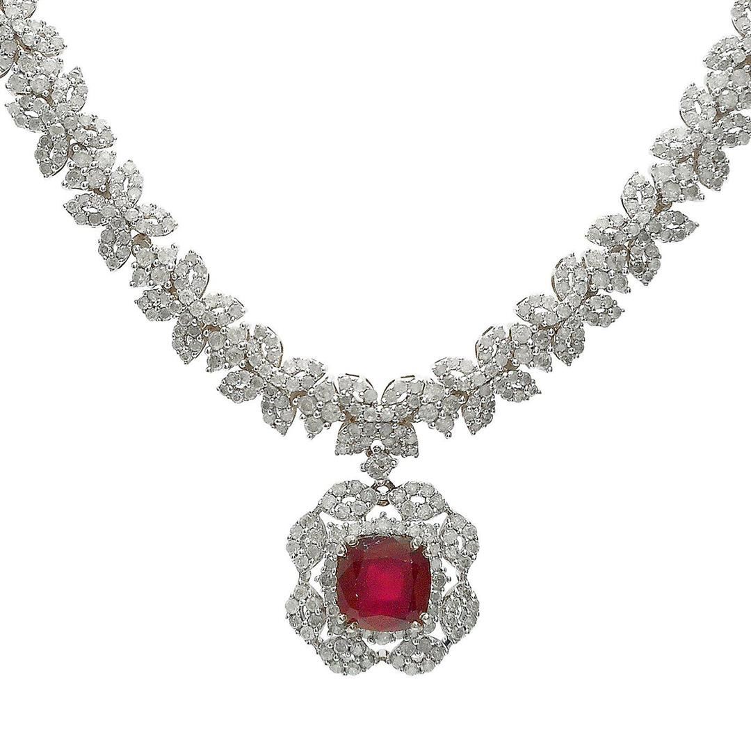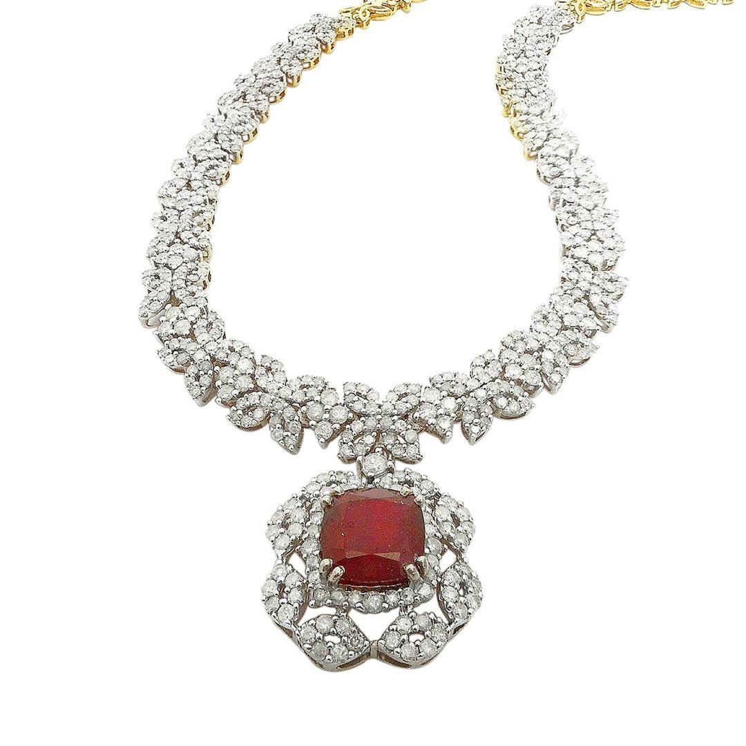 One electronically tested 14KT yellow gold ladies cast & assembled ruby and diamond necklace. Seventeen and three-quarter inch length necklace features a stylized ruby and diamond pendant supported by a flexible diamond ribbon transitioning into matching yellow gold links, terminating in a concealed clasp with safety. Bright polish finish with rhodium accents. Trademark is Orianne. Identified with markings of "14K". Condition is new, good workmanship. One prong set square cushion mixed cut natural ruby, measuring 8.75 x 8.65 x 5.50mm, approximate weight of 4.28ct., clarity is heavily included, type II, dark, very slightly brownish, slightly purplish red color, (GIA slpR 7/3), cut is good. Transmitting light somewhat diffusely, transparent to translucent. Naturally occurring internal & external characteristics are present. Indications of laboratory high temperature heat treatment, with glass & flux additives. Graded in the setting. Ruby has a low tolerance to rhodiumplating, repolishing the surface, & ultrasonic cleaning. Six Hundred One prong set round brilliant cut diamonds approximate total weight of 601 Stones = 7.96ct. Graded in the setting. Clarity I-1 to I-3 Color K - M