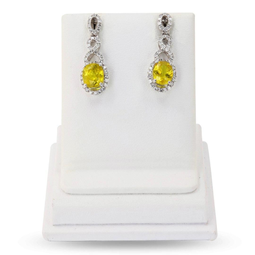One pair electronically tested platinum cast and assembled yellow sapphire and diamond dangle earrings with standard backs. Condition is new, good workmanship. Each earring features a yellow sapphire and diamond ribbon dangle. Bright polish finish. Trademark is Orianne. Identified with markings of "PT950". Containing: Two prong set oval mixed cut natural yellow sapphires, measuring 7.40mm x 6.20mm x 4.60mm, approximate total weight of 4.29ct., clarity is moderately included, medium dark, slightly brownish, yellow color, (GIA Y 6/2), cut is good. Measurements are an average for the pair. Transmitting light somewhat diffusely, transparent to translucent. Naturally occurring internal and external characteristics are present. Graded in the setting. Forty round brilliant cut diamonds (depth est.) approximate total weight of 40 Stones = 0.70ct. Total Weight of Colored Stones 4.29ct.Total Weight of Diamonds 0.70ct.Total Weight of Dangle Earrings 5.70 gm