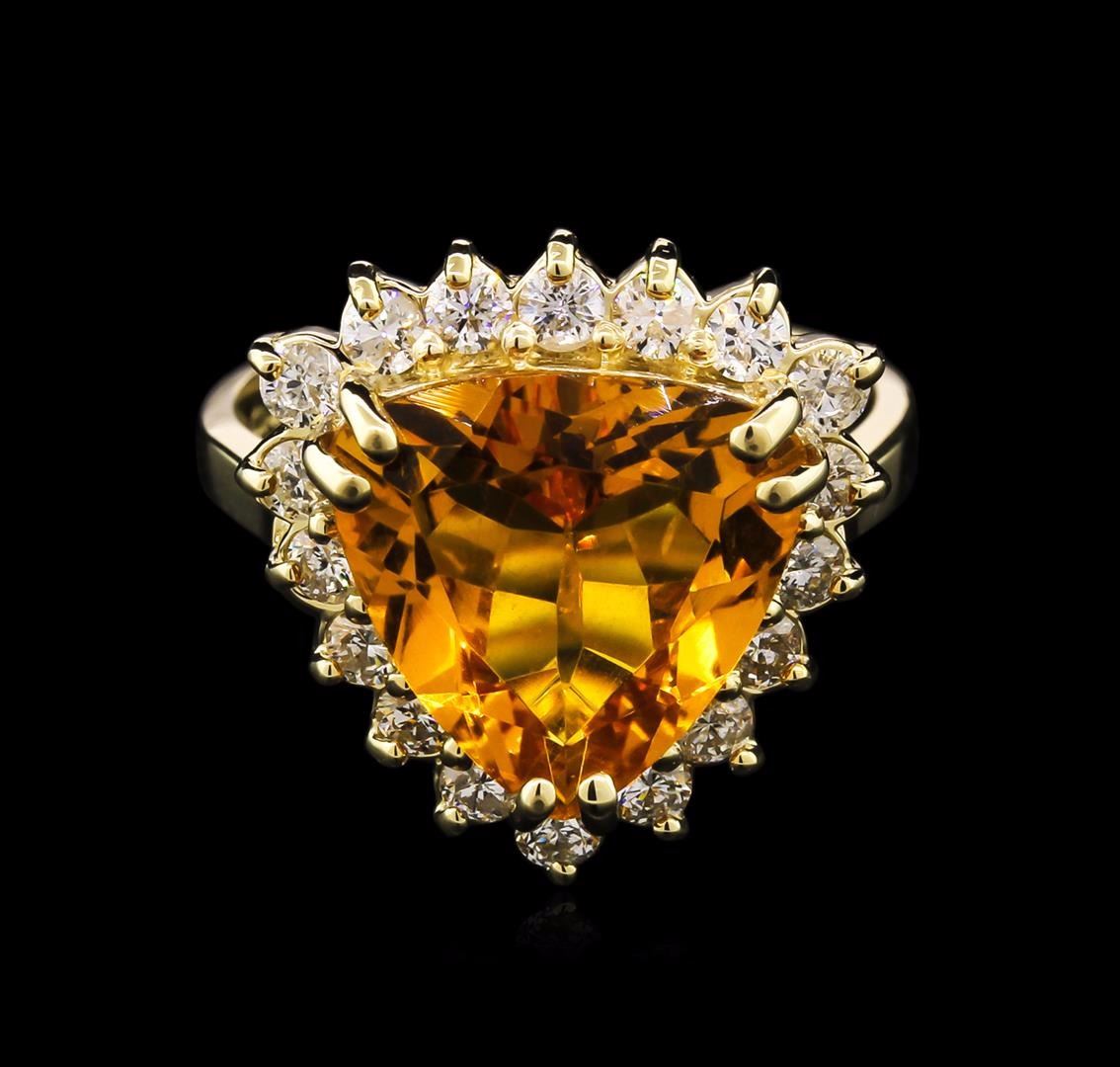 One electronically tested 14KT yellow gold lady's cast fashion ring with a basket halo with a bright polish finish. The featured lady's ring has a shank measuring 2.67 millimeters in width. Identified with markings of "K14". Condition is new, good workmanship. Containing: One prong set triangle modified brilliant cut natural citrine quartz, measuring 11.95 x 11.80 x 6.46mm, approximate weight of 4.29ct., clarity is eye clean, type I, medium, brownish, yellowish orange color, (GIA yO 5/3), cut is very good. Transmitting light with no distortion, transparent. Colored gemstones are presumed to have been subjected to commonly used enhancement processes. Graded in the setting. Eighteen prong set round brilliant cut diamonds, measuring 2.30 - 2.20 x 1.35mm (depth est.) approximate total weight of 18 Stones = 0.75ct. Graded in the setting. Clarity: SI-1 to I-1. Color: H - I. Cut Good. Total Weight of Colored Stones 4.29ct. Total Weight of Diamonds 0.75ct. Total Weight of Ring 6.20gm. GAS Appraised at $3,230.00.
