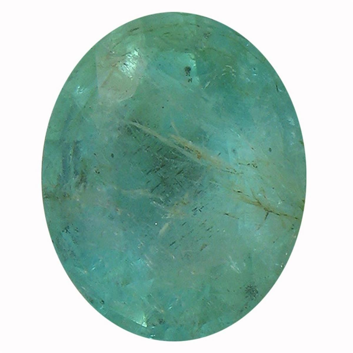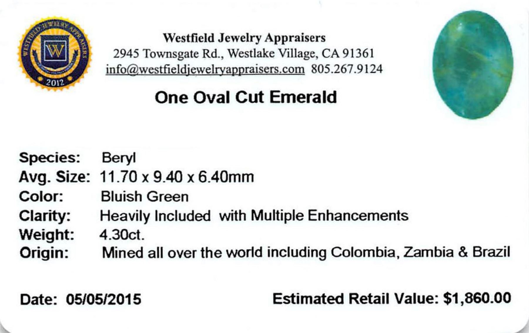 One oval mixed cut natural emerald, measuring 11.70 x 9.40 x 6.40mm, exact weight 4.30 ct., clarity is heavily included, type III, dark, very slightly grayish, bluish green color, (GIA bG 7/3), cut is good. Indications of multiple laboratory enhancements, including high temperature heat treatment. Westfield Appraised.