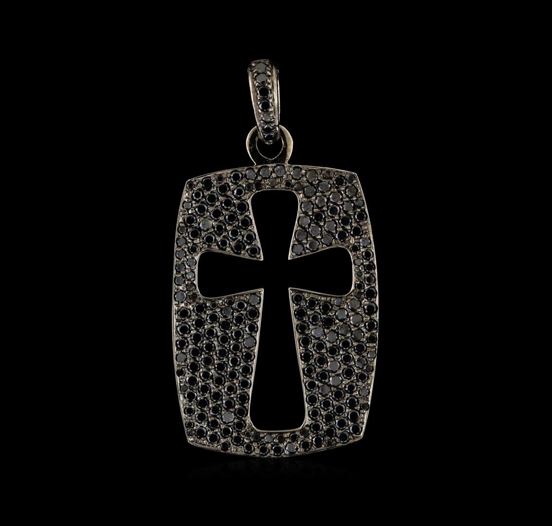 One electronically tested 14KT white gold cast & assembled black diamond cross pendant with an anodized finish. The pendant features an open cross design set within a black diamond gallery, completed by a black diamond bail. Area measurements two and one-eighths inch by one and one-eighths inch. Identified with markings of "14K". Condition is new, good workmanship. Containing: One Hundred Eighty-Eight bead set round brilliant cut diamonds, measuring 1.90 - 1.70 x 1.08mm (depth est.) approximate total weight of 188 Stones = 4.10ct. Indications of multiple laboratory enhancements. The specific gravity of black diamond is 3.120 to 3.165. Diamond tester results are non-reactive. Graded in the setting. Clarity Déclassé,. Color: Fancy Black; Irradiated. Thirty bead set round brilliant cut diamonds, measuring 1.30 - 1.00 x 0.69mm (depth est.) approximate total weight of 30 Stones = 0.20ct. Indications of multiple laboratory enhancements. The specific gravity of black diamond is 3.120 to 3.165. Diamond tester results are non-reactive. Graded in the setting. Clarity Déclassé‚. Color: Fancy Black; Irradiated. Total Weight of Diamonds 4.30ct. Total Weight of Pendant 12.82gm. AIG Appraised at $6,745.00.