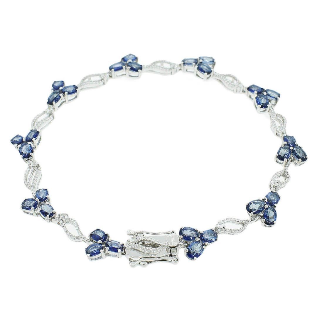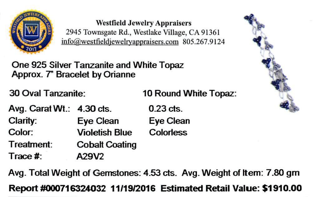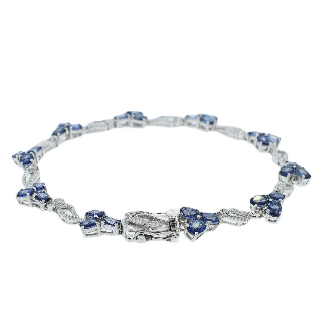 Electronically tested 925 silver ladies cast & assembled tanzanite and white topaz bracelet. Seven inch length bracelet features a flexible tanzanite trio and white topaz accented ribbon, terminating in a concealed clasp with twin safeties. Bright polish