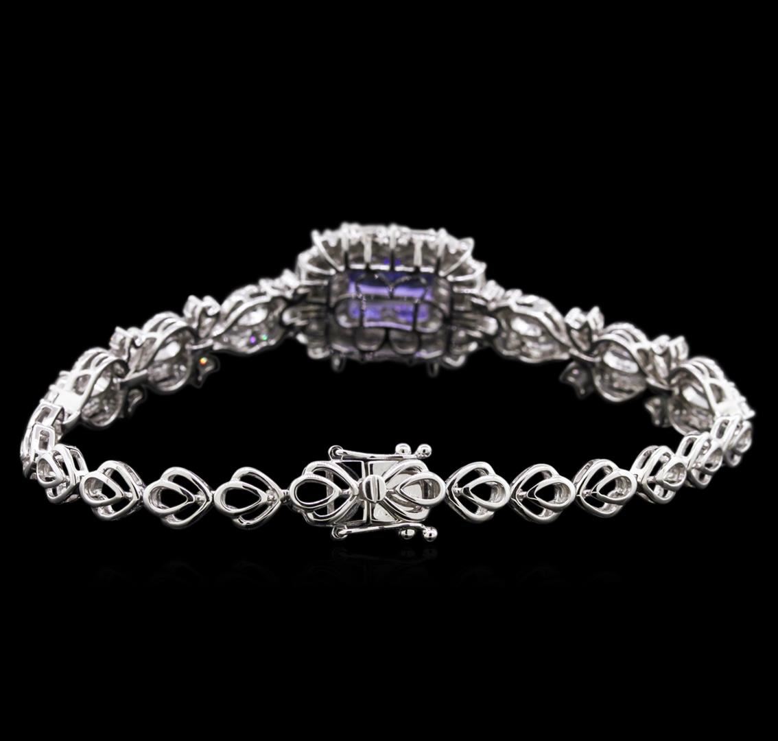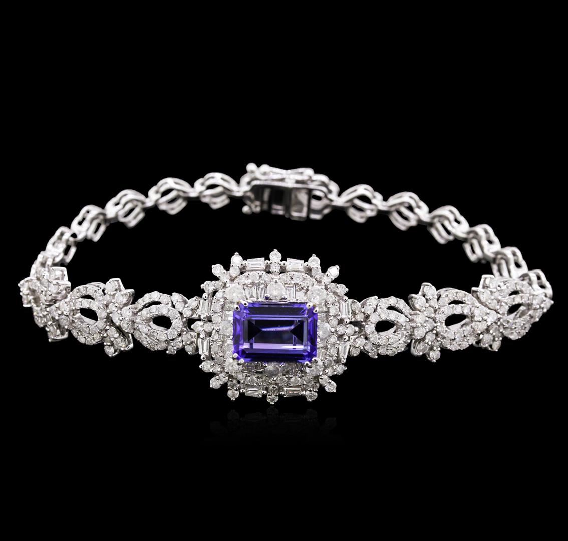 One electronically tested 14KT white gold ladies cast & assembled tanzanite and diamond bracelet. Seven inch length bracelet features a stylized tanzanite and diamond center supported by a flexible diamond ribbon transitioning into matching white gold links, terminating in a concealed clasp with twin safeties. Bright polish finish. Trademark is Orianne. Identified with markings of "14K". Condition is new, good workmanship. Containing: One prong set rectangular step cut natural tanzanite approximate weight of 4.31ct., clarity is eye clean, type I, medium dark, very slightly grayish, bluish violet color, (GIA bV 6/3), cut is good. Transmitting light with no distortion, transparent. Graded in the setting. Tanzanite is a very rare gemstone that is only found in the country of Tanzania. Originally discovered in 1967. Tiffany & Company, named the stone Tanzanite. It is found in the Usumburu Mountains that border the Umba Valley of northern Tanzania. Tanzanite occurs in gray, brown, violet, blue, reddish-purple, & green. The gem is interesting because of its exceptional pleochroism. Rotated in different directions a tanzanite will exhibit multiple changes of color. Tanzanite has a low tolerance to ultrasonic cleaning, and should not be cleaned using this method. Two Hundred Fifty-Four prong set round brilliant & baguette cut diamonds approximate total weight of 254 Stones = 3.88ct. The clarity grade reflects the entire range of clarity for this group. Graded in the setting. Clarity: VS-2 to I-1. Color: G - I. Total Weight of Colored Stones 4.31ct. Total Weight of Diamonds 3.88ct. Total Weight of Bracelet 18.54gm. AIG Appraised at $24,580.00.