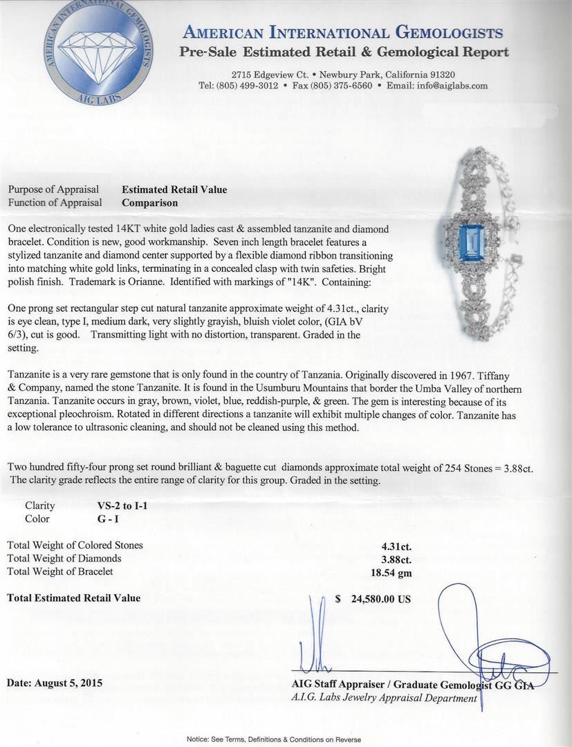 One electronically tested 14KT white gold ladies cast & assembled tanzanite and diamond bracelet. Seven inch length bracelet features a stylized tanzanite and diamond center supported by a flexible diamond ribbon transitioning into matching white gold links, terminating in a concealed clasp with twin safeties. Bright polish finish. Trademark is Orianne. Identified with markings of "14K". Condition is new, good workmanship. Containing: One prong set rectangular step cut natural tanzanite approximate weight of 4.31ct., clarity is eye clean, type I, medium dark, very slightly grayish, bluish violet color, (GIA bV 6/3), cut is good. Transmitting light with no distortion, transparent. Graded in the setting. Tanzanite is a very rare gemstone that is only found in the country of Tanzania. Originally discovered in 1967. Tiffany & Company, named the stone Tanzanite. It is found in the Usumburu Mountains that border the Umba Valley of northern Tanzania. Tanzanite occurs in gray, brown, violet, blue, reddish-purple, & green. The gem is interesting because of its exceptional pleochroism. Rotated in different directions a tanzanite will exhibit multiple changes of color. Tanzanite has a low tolerance to ultrasonic cleaning, and should not be cleaned using this method. Two Hundred Fifty-Four prong set round brilliant & baguette cut diamonds approximate total weight of 254 Stones = 3.88ct. The clarity grade reflects the entire range of clarity for this group. Graded in the setting. Clarity: VS-2 to I-1. Color: G - I. Total Weight of Colored Stones 4.31ct. Total Weight of Diamonds 3.88ct. Total Weight of Bracelet 18.54gm. AIG Appraised at $24,580.00.