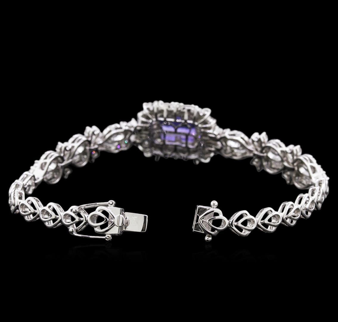 One electronically tested 14KT white gold ladies cast & assembled tanzanite and diamond bracelet. Seven inch length bracelet features a stylized tanzanite and diamond center supported by a flexible diamond ribbon transitioning into matching white gold links, terminating in a concealed clasp with twin safeties. Bright polish finish. Trademark is Orianne. Identified with markings of "14K". Condition is new, good workmanship. Containing: One prong set rectangular step cut natural tanzanite approximate weight of 4.31ct., clarity is eye clean, type I, medium dark, very slightly grayish, bluish violet color, (GIA bV 6/3), cut is good. Transmitting light with no distortion, transparent. Graded in the setting. Tanzanite is a very rare gemstone that is only found in the country of Tanzania. Originally discovered in 1967. Tiffany & Company, named the stone Tanzanite. It is found in the Usumburu Mountains that border the Umba Valley of northern Tanzania. Tanzanite occurs in gray, brown, violet, blue, reddish-purple, & green. The gem is interesting because of its exceptional pleochroism. Rotated in different directions a tanzanite will exhibit multiple changes of color. Tanzanite has a low tolerance to ultrasonic cleaning, and should not be cleaned using this method. Two Hundred Fifty-Four prong set round brilliant & baguette cut diamonds approximate total weight of 254 Stones = 3.88ct. The clarity grade reflects the entire range of clarity for this group. Graded in the setting. Clarity: VS-2 to I-1. Color: G - I. Total Weight of Colored Stones 4.31ct. Total Weight of Diamonds 3.88ct. Total Weight of Bracelet 18.54gm. AIG Appraised at $24,580.00.