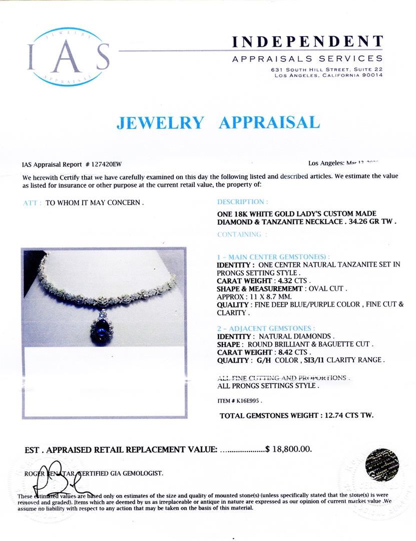 4.32ct Tanzanite and 8.42ctw Diamond 18K White Gold Necklace. Please see Photos and Description for all available information. This necklace features a unique and elegant design. This necklace is made up of an 18K white gold chain, a 4.32ct Tanzanite center stone, and a total of 8.42ctw round brilliant and baguette cut diamonds. The Tanzanite center stone is surrounded by round brilliant and baguette cut diamonds.