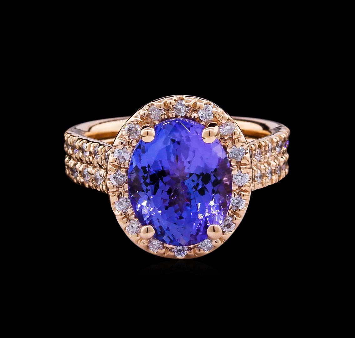 One electronically tested 14KT rose gold lady's cast fashion ring with a double shank with a basket halo with a bright polish finish. The featured lady's ring has a double shank measuring 4.25 millimeters wide. Identified with markings of "14K". Condition is new, good workmanship. Containing: One prong set oval modified brilliant cut natural tanzanite, measuring 10.66 x 8.67 x 6.33mm, 5%. bulge factor, approximate weight of 4.32ct., clarity is eye clean, type I, medium, moderately strong, bluish violet color, (GIA bV 5/4), cut is very good. Transmitting light with no distortion, transparent. Colored gemstones are presumed to have been subjected to commonly used enhancement processes. Graded in the setting. Fifty-Two prong set round brilliant cut diamonds, measuring 1.45 - 1.35 x 0.88mm (depth est.) approximate total weight of 52 Stones = 0.55ct. Graded in the setting. Clarity: SI-1 to I-1. Color: H - I. Cut Good. Total Weight of Colored Stones 4.32ct. Total Weight of Diamonds 0.55ct. Total Weight of Ring 7.50gm. GAS Appraised at $9,155.00.