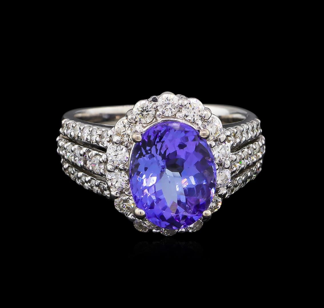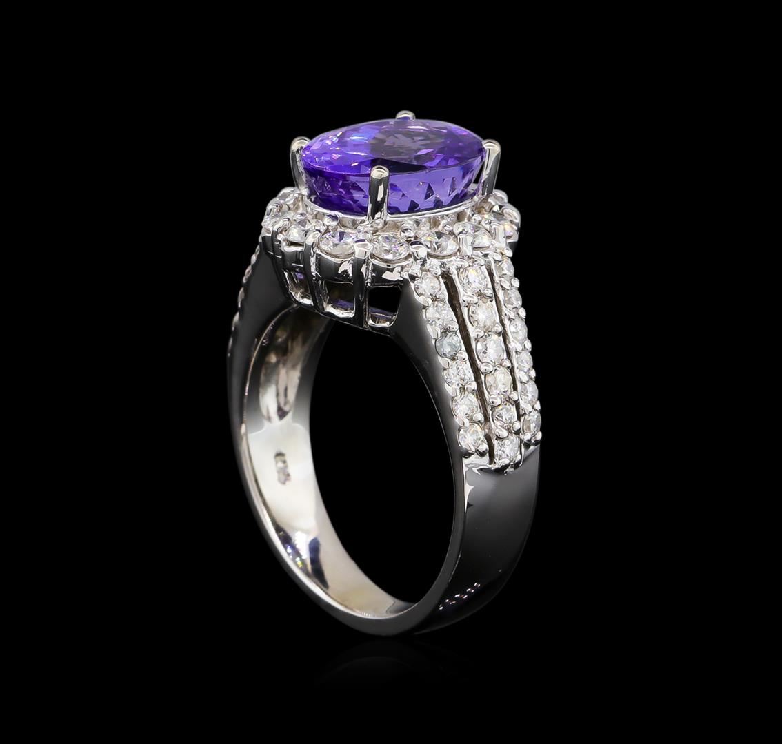 One electronically tested 14KT white gold lady's cast fashion ring with a three row basket halo with a bright polish finish. The featured lady's ring has a shank measuring 3.85 millimeters wide. Identified with markings of "K14". Condition is new, good workmanship. Containing: One prong set oval modified brilliant cut natural tanzanite, measuring 11.07 x 8.69 x 6.34mm, approximate weight of 4.33ct., clarity is eye clean, type I, medium, very slightly grayish, bluish violet color, (GIA bV 5/3), cut is good. Transmitting light with no distortion, transparent. Colored gemstones are presumed to have been subjected to commonly used enhancement processes. Graded in the setting. Fourteen prong set round brilliant cut diamonds, measuring 2.30 - 2.20 x 1.40mm (depth est.) approximate total weight of 14 Stones = 0.60ct. Graded in the setting. Clarity: SI-1 to I-1. Color: G - Good Eight prong set round brilliant cut diamonds, measuring 1.90 - 1.80 x 1.15mm (depth est.) approximate total weight of 8 Stones = 0.20ct. Graded in the setting. Clarity: SI-1 to I-1. Color: H - I. Cut Good Twenty-Eight prong set round brilliant cut diamonds, measuring 1.55 - 1.45 x 0.93mm (depth est.) approximate total weight of 28 Stones = 0.36ct. Graded in the setting. Clarity: SI-1 to I-1. Color: H - I. Cut Good. Total Weight of Colored Stones 4.33ct. Total Weight of Diamonds 1.16ct. Total Weight of Ring 8.20gm. GAS Appraised at $9,740.00.