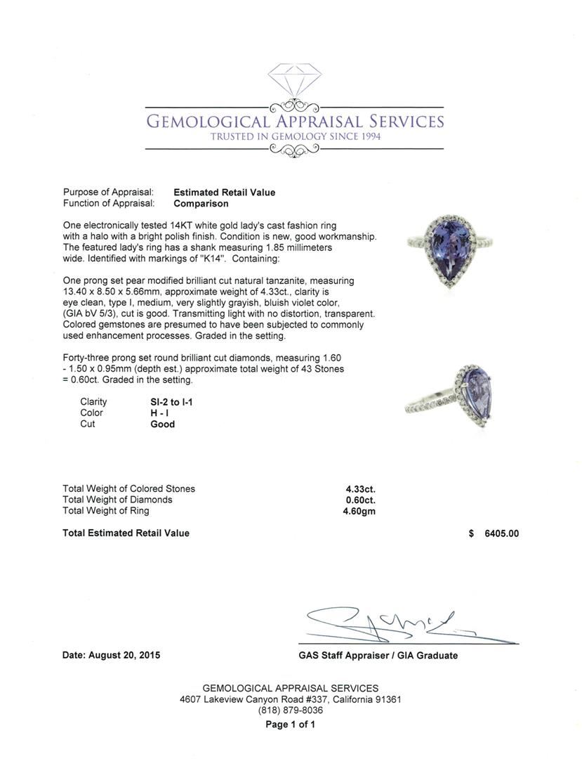 One electronically tested 14KT white gold lady's cast fashion ring with a halo with a bright polish finish. The featured lady's ring has a shank measuring 1.85 millimeters wide. Identified with markings of "K14". Condition is new, good workmanship. Containing: One prong set pear modified brilliant cut natural tanzanite, measuring 13.40 x 8.50 x 5.66mm, approximate weight of 4.33ct., clarity is eye clean, type I, medium, very slightly grayish, bluish violet color, (GIA bV 5/3), cut is good. Transmitting light with no distortion, transparent. Colored gemstones are presumed to have been subjected to commonly used enhancement processes. Graded in the setting. Forty-Three prong set round brilliant cut diamonds, measuring 1.60 - 1.50 x 0.95mm (depth est.) approximate total weight of 43 Stones = 0.60ct. Graded in the setting. Clarity: SI-2 to I-1. Color: H - I. Cut Good. Total Weight of Colored Stones 4.33ct. Total Weight of Diamonds 0.60ct. Total Weight of Ring 4.60gm. GAS Appraised at $6,405.00.