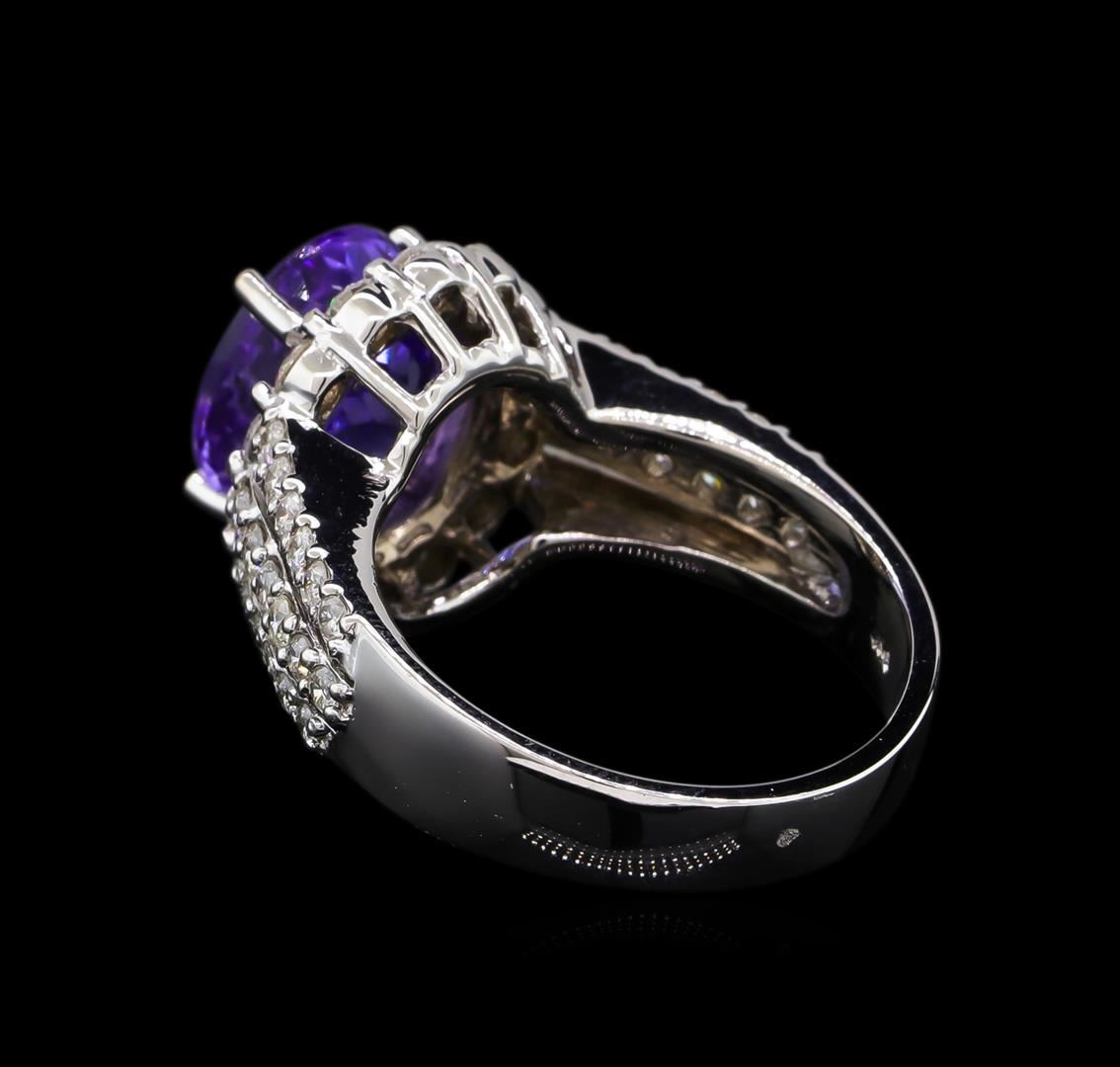 One electronically tested 14KT white gold lady's cast fashion ring with a three row basket halo with a bright polish finish. The featured lady's ring has a shank measuring 3.85 millimeters wide. Identified with markings of "K14". Condition is new, good workmanship. Containing: One prong set oval modified brilliant cut natural tanzanite, measuring 11.07 x 8.69 x 6.34mm, approximate weight of 4.33ct., clarity is eye clean, type I, medium, very slightly grayish, bluish violet color, (GIA bV 5/3), cut is good. Transmitting light with no distortion, transparent. Colored gemstones are presumed to have been subjected to commonly used enhancement processes. Graded in the setting. Fourteen prong set round brilliant cut diamonds, measuring 2.30 - 2.20 x 1.40mm (depth est.) approximate total weight of 14 Stones = 0.60ct. Graded in the setting. Clarity: SI-1 to I-1. Color: G - Good Eight prong set round brilliant cut diamonds, measuring 1.90 - 1.80 x 1.15mm (depth est.) approximate total weight of 8 Stones = 0.20ct. Graded in the setting. Clarity: SI-1 to I-1. Color: H - I. Cut Good Twenty-Eight prong set round brilliant cut diamonds, measuring 1.55 - 1.45 x 0.93mm (depth est.) approximate total weight of 28 Stones = 0.36ct. Graded in the setting. Clarity: SI-1 to I-1. Color: H - I. Cut Good. Total Weight of Colored Stones 4.33ct. Total Weight of Diamonds 1.16ct. Total Weight of Ring 8.20gm. GAS Appraised at $9,740.00.