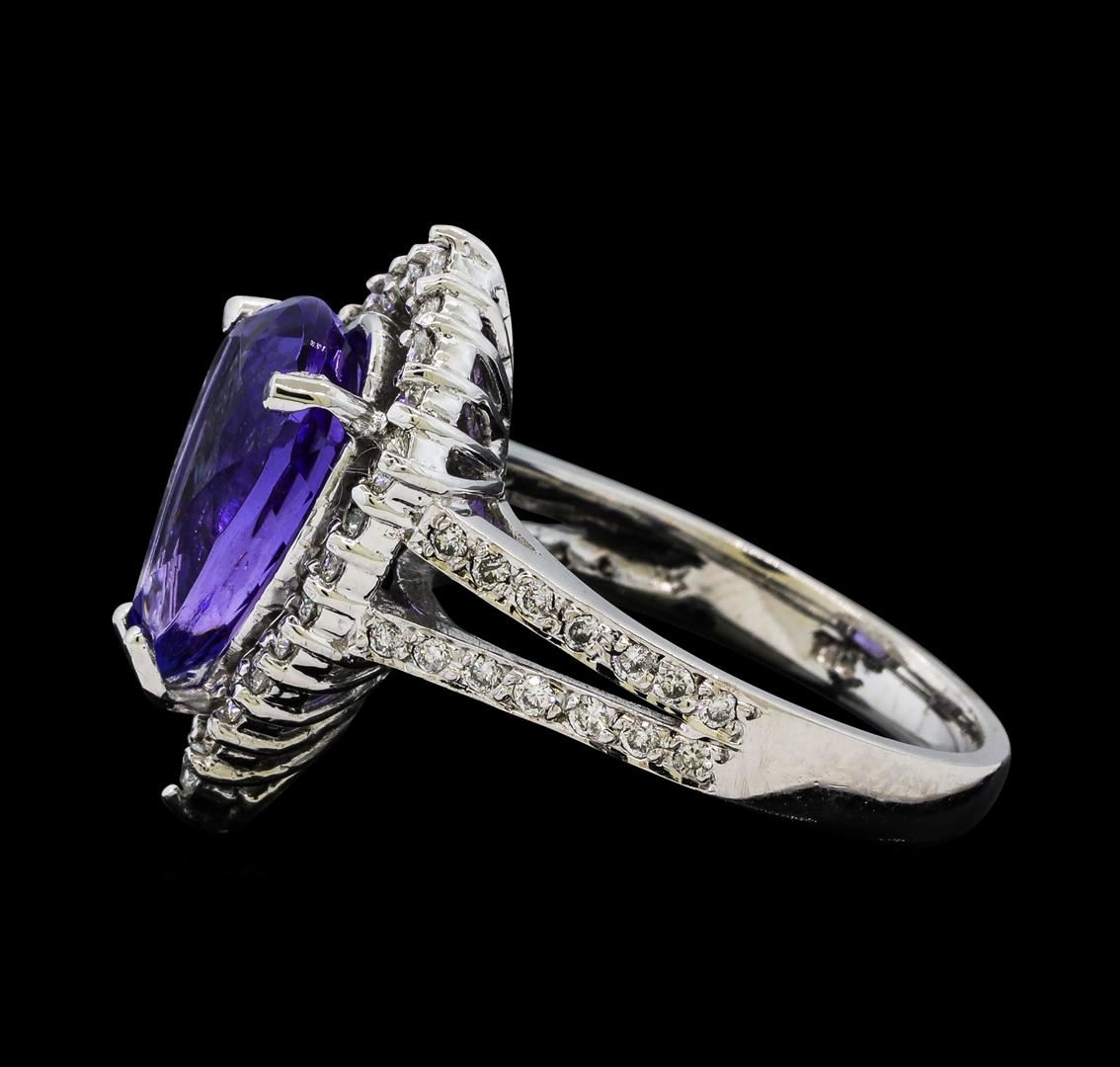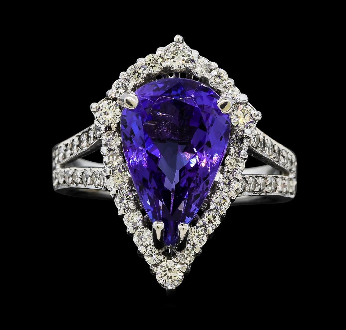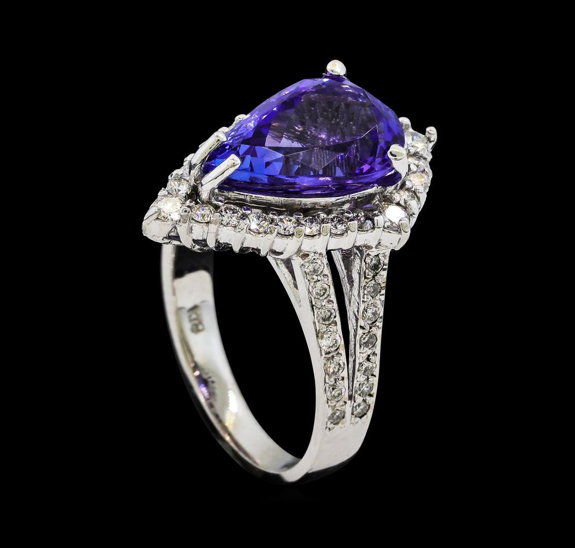 One electronically tested 14KT white gold lady's cast fashion ring with a split shank basket halo with a bright polish finish. The featured lady's ring has a shank measuring 2.70 millimeters wide. Identified with markings of 'K14'. Condition is new, good workmanship. Containing: One prong set pear modified brilliant cut natural tanzanite, measuring 13.05 x 8.55 x 5.60mm, (depth est.) approximate weight of 4.33ct., clarity is eye clean, medium dark, moderately strong, violetish blue color, (GIA vB 6/4), cut is very good. Transmitting light with no distortion, transparent. Colored gemstones are presumed to have been subjected to commonly used enhancement processes. Graded in the setting. Four prong set round brilliant cut diamonds, measuring 2.05 - 1.95 x 1.20mm (depth est.) approximate total weight of 4 Stones = 0.12ct. Graded in the setting. Clarity SI-1. Color: H Cut Good Forty-Eight prong set round brilliant cut diamonds, measuring 1.50 - 1.35 x 0.89mm (depth est.) approximate total weight of 48 Stones = 0.55ct. Graded in the setting. Clarity SI-1 to SI-2. Color: H - I Cut Good. Total Weight of Colored Stones 4.33ct.. Total Weight of Diamonds 0.67ct.. Total Weight of Ring 6.30gm. GAS Appraised at $10,255.00.