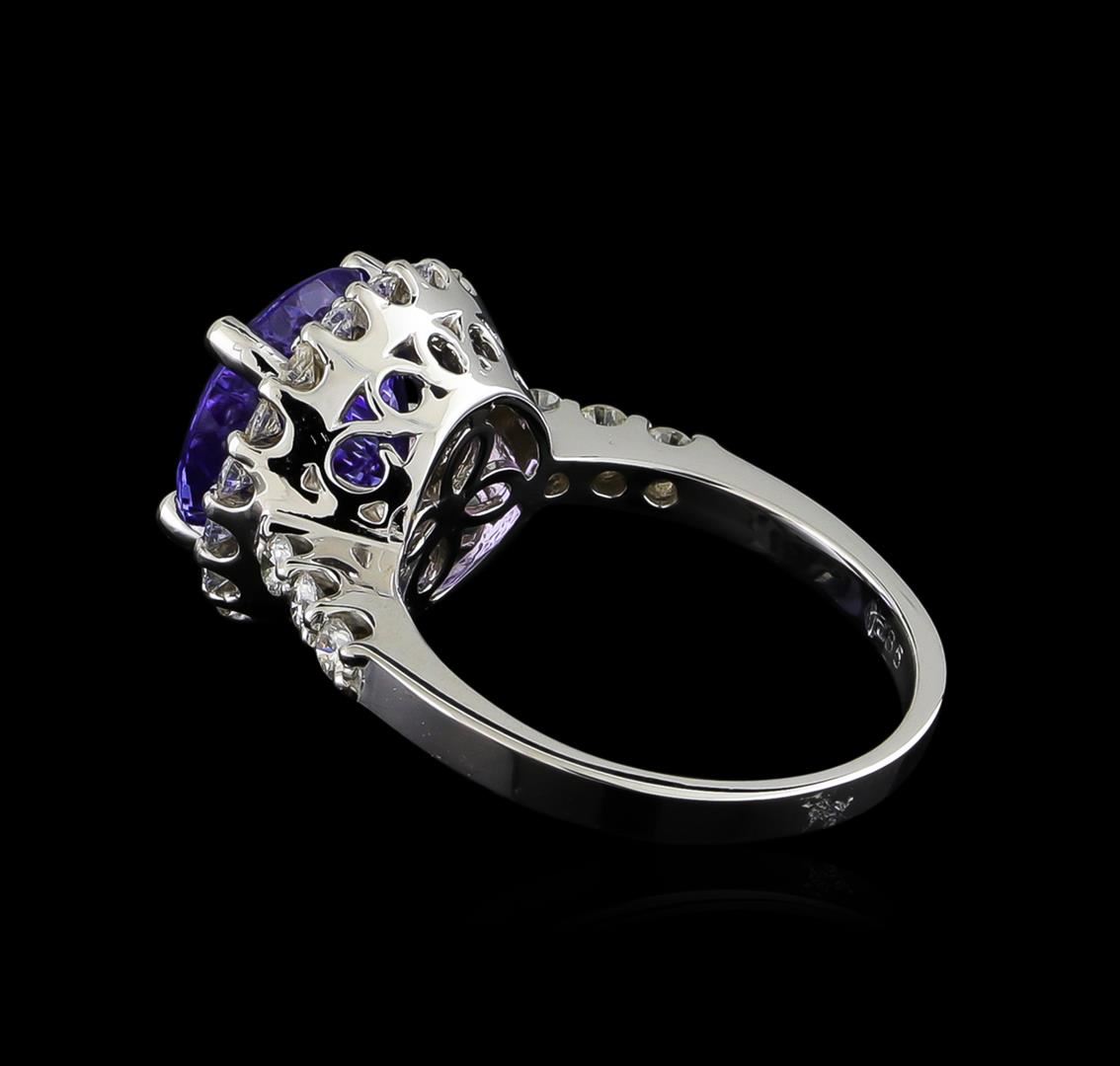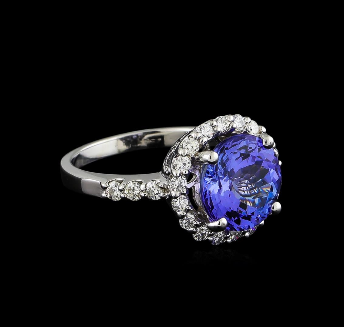 One electronically tested 14KT white gold ladies cast tanzanite and diamond ring. The featured tanzanite is set within a diamond bezel supported by an elaborate lattice under gallery and diamond set shoulders, completed by a two millimeter wide band. Identified with markings of "14K 585". Condition is new, good workmanship. Containing: One prong set round mixed cut natural tanzanite, measuring 9.90 - 9.85 x 6.30 mm, 5%. bulge factor, approximate weight of 4.34ct., clarity is eye clean, type I, medium dark, very slightly grayish, bluish violet color, (GIA bV 6/3), cut is good. Transmitting light with no distortion, transparent. Graded in the setting. Tanzanite is a very rare gemstone that is only found in the country of Tanzania. Originally discovered in 1967. Tiffany & Company, named the stone Tanzanite. It is found in the Usumburu Mountains that border the Umba Valley of northern Tanzania. Tanzanite occurs in gray, brown, violet, blue, reddish-purple, & green. The gem is interesting because of its exceptional pleochroism. Rotated in different directions a tanzanite will exhibit multiple changes of color. Tanzanite has a low tolerance to ultrasonic cleaning, and should not be cleaned using this method. Six prong set round brilliant cut diamonds, measuring 2.10 - 1.90 x 1.20mm (depth est.) approximate. Total Weight of 6 Stones = 0.18ct. Graded in the setting. Clarity: I-1 to I-2. Color: F - H Eighteen prong set round brilliant cut diamonds, measuring 1.75 - 1.70 x 1.04mm (depth est.) approximate. Total Weight of 18 Stones = 0.36ct. Graded in the setting. Clarity: SI-2 to I-2. Color: G - H. Total Weight of Colored Stones 4.34ct. Total Weight of Diamonds 0.54ct. Total Weight of Ring 5.04gm. AIG Appraised at $11,470.00.