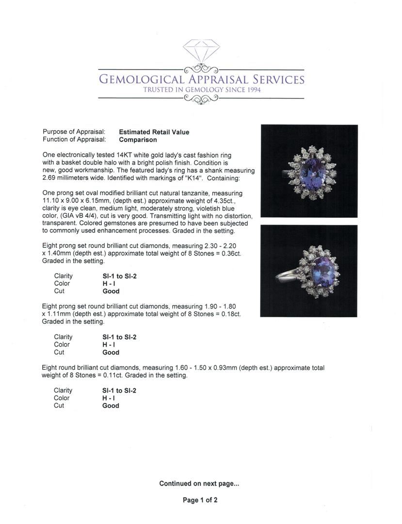 One electronically tested 14KT white gold lady's cast fashion ring with a basket double halo with a bright polish finish. The featured lady's ring has a shank measuring 2.69 millimeters wide. Identified with markings of "K14". Condition is new, good workmanship. Containing: One prong set oval modified brilliant cut natural tanzanite, measuring 11.10 x 9.00 x 6.15mm, (depth est.) approximate weight of 4.35ct., clarity is eye clean, medium light, moderately strong, violetish blue color, (GIA vB 4/4), cut is very good. Transmitting light with no distortion, transparent. Colored gemstones are presumed to have been subjected to commonly used enhancement processes. Graded in the setting. Eight prong set round brilliant cut diamonds, measuring 2.30 - 2.20 x 1.40mm (depth est.) approximate total weight of 8 Stones = 0.36ct. Graded in the setting. Clarity: SI-1 to SI-2. Color: H - I. Cut Good Eight prong set round brilliant cut diamonds, measuring 1.90 - 1.80 x 1.11mm (depth est.) approximate total weight of 8 Stones = 0.18ct. Graded in the setting. Clarity: SI-1 to SI-2. Color: H - I. Cut Good Eight round brilliant cut diamonds, measuring 1.60 - 1.50 x 0.93mm (depth est.) approximate total weight of 8 Stones = 0.11ct. Graded in the setting. Clarity: SI-1 to SI-2. Color: H - I. Cut Good. Total Weight of Colored Stones 4.35ct. Total Weight of Diamonds 0.65ct. Total Weight of Ring 5.70gm. GAS Appraised at $8,205.00.