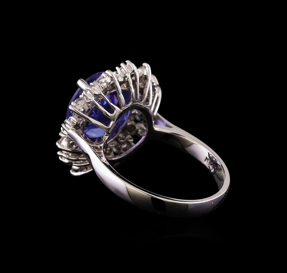 One electronically tested 14KT white gold lady's cast fashion ring with a basket double halo with a bright polish finish. The featured lady's ring has a shank measuring 2.69 millimeters wide. Identified with markings of "K14". Condition is new, good workmanship. Containing: One prong set oval modified brilliant cut natural tanzanite, measuring 11.10 x 9.00 x 6.15mm, (depth est.) approximate weight of 4.35ct., clarity is eye clean, medium light, moderately strong, violetish blue color, (GIA vB 4/4), cut is very good. Transmitting light with no distortion, transparent. Colored gemstones are presumed to have been subjected to commonly used enhancement processes. Graded in the setting. Eight prong set round brilliant cut diamonds, measuring 2.30 - 2.20 x 1.40mm (depth est.) approximate total weight of 8 Stones = 0.36ct. Graded in the setting. Clarity: SI-1 to SI-2. Color: H - I. Cut Good Eight prong set round brilliant cut diamonds, measuring 1.90 - 1.80 x 1.11mm (depth est.) approximate total weight of 8 Stones = 0.18ct. Graded in the setting. Clarity: SI-1 to SI-2. Color: H - I. Cut Good Eight round brilliant cut diamonds, measuring 1.60 - 1.50 x 0.93mm (depth est.) approximate total weight of 8 Stones = 0.11ct. Graded in the setting. Clarity: SI-1 to SI-2. Color: H - I. Cut Good. Total Weight of Colored Stones 4.35ct. Total Weight of Diamonds 0.65ct. Total Weight of Ring 5.70gm.