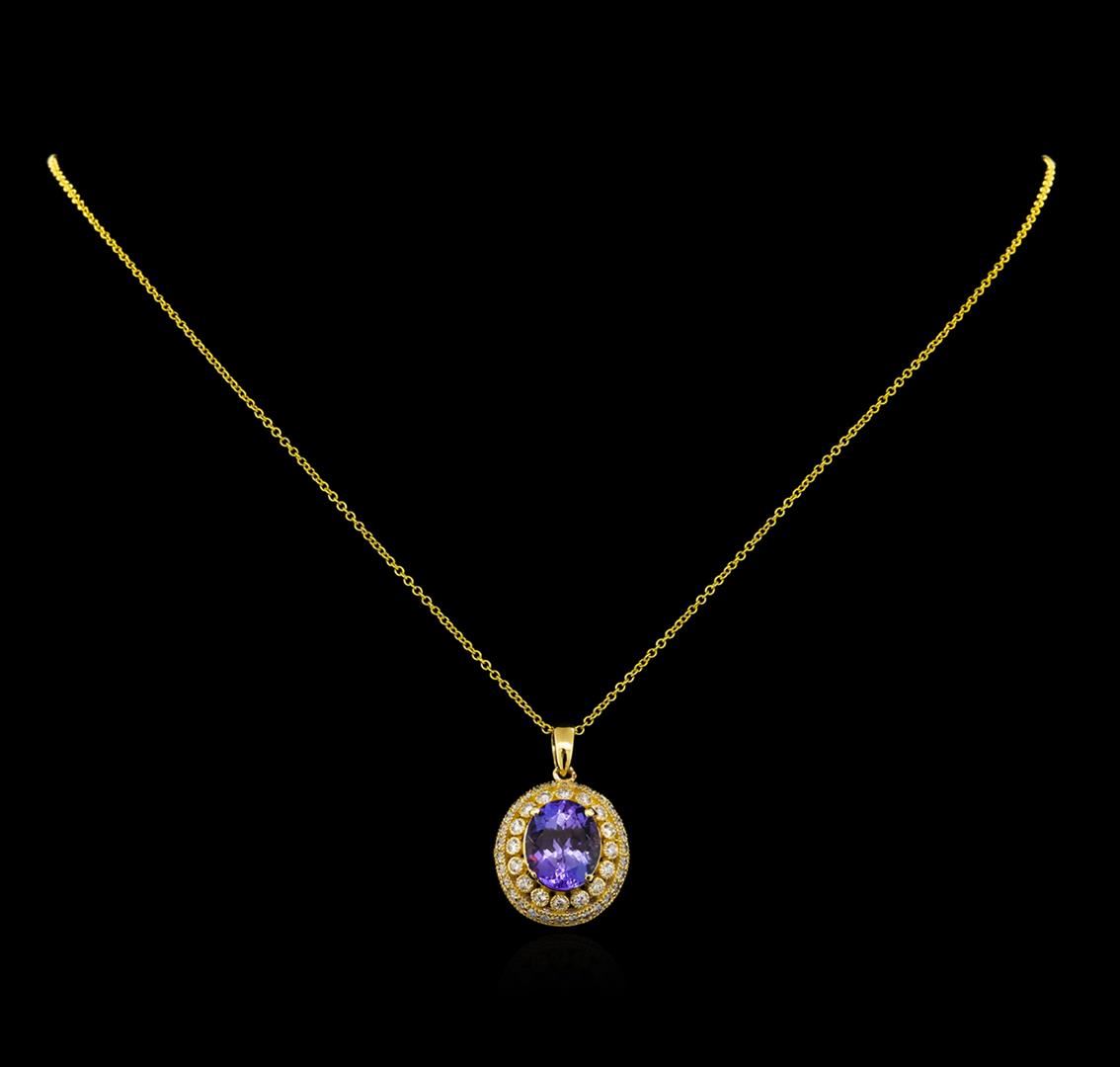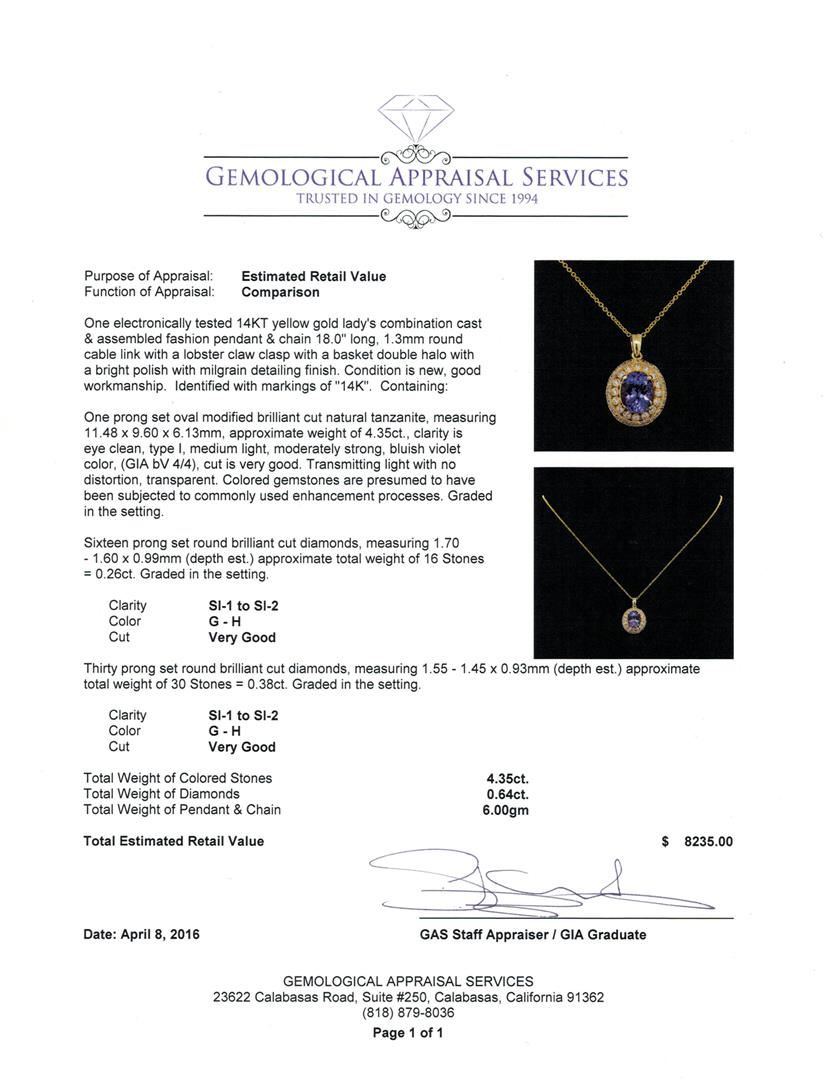 One electronically tested 14KT yellow gold lady's combination cast & assembled fashion pendant & chain 18.0" long, 1.3mm round cable link with a lobster claw clasp with a basket double halo with a bright polish with milgrain detailing finish. Identified with markings of "14K". Condition is new, good workmanship. Containing: One prong set oval modified brilliant cut natural tanzanite, measuring 11.48 x 9.60 x 6.13mm, approximate weight of 4.35ct., clarity is eye clean, type I, medium light, moderately strong, bluish violet color, (GIA bV 4/4), cut is very good. Transmitting light with no distortion, transparent. Colored gemstones are presumed to have been subjected to commonly used enhancement processes. Graded in the setting. Sixteen prong set round brilliant cut diamonds, measuring 1.70 - 1.60 x 0.99mm (depth est.) approximate total weight of 16 Stones = 0.26ct. Graded in the setting. Clarity: SI-1 to SI-2. Color: G - Very Good Thirty prong set round brilliant cut diamonds, measuring 1.55 - 1.45 x 0.93mm (depth est.) approximate total weight of 30 Stones = 0.38ct. Graded in the setting. Clarity: SI-1 to SI-2. Color: G - Very Good. Total Weight of Colored Stones 4.35ct. Total Weight of Diamonds 0.64ct. Total Weight of Pendant & Chain 6.00gm. GAS Appraised at $8,235.00.