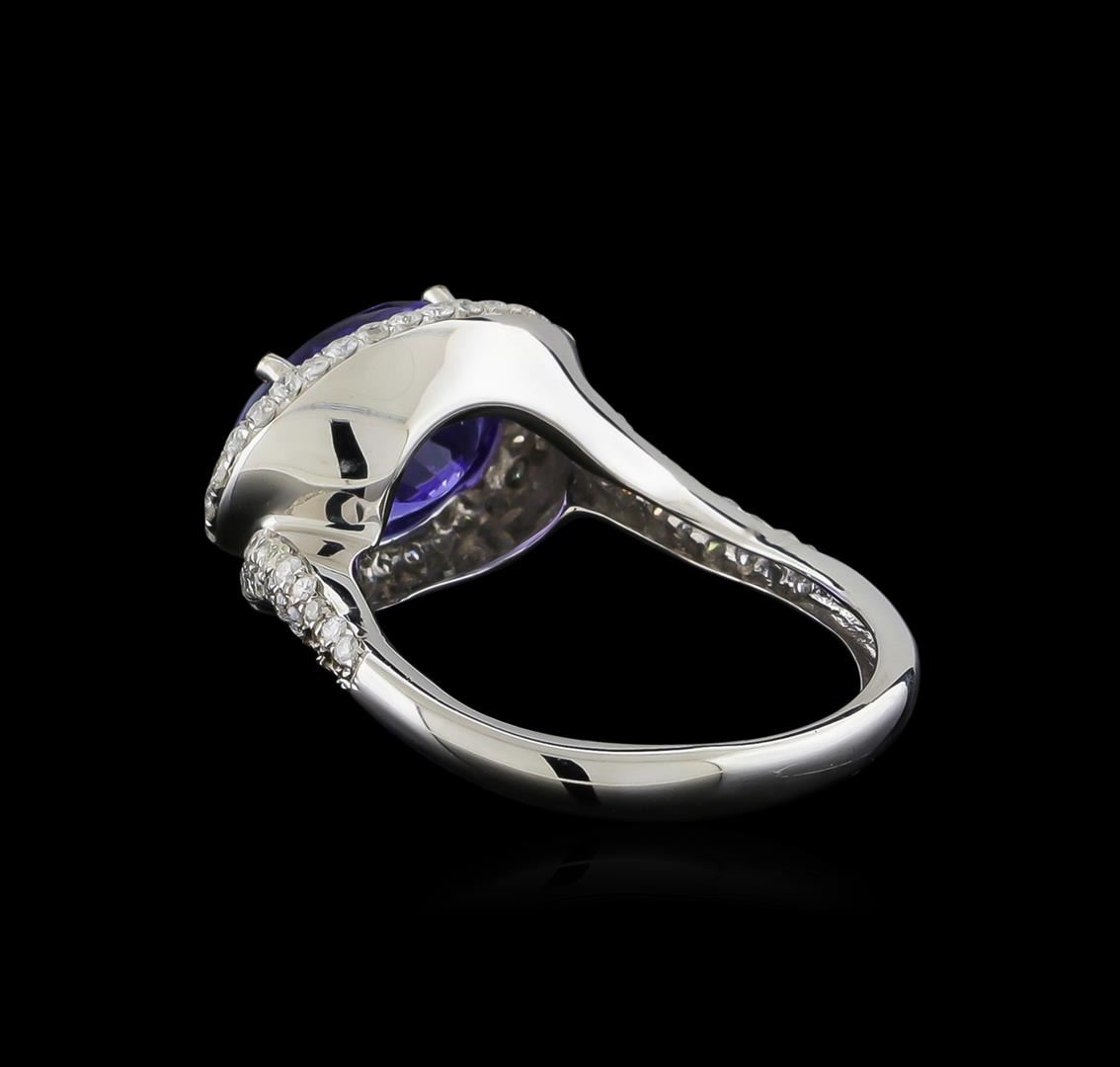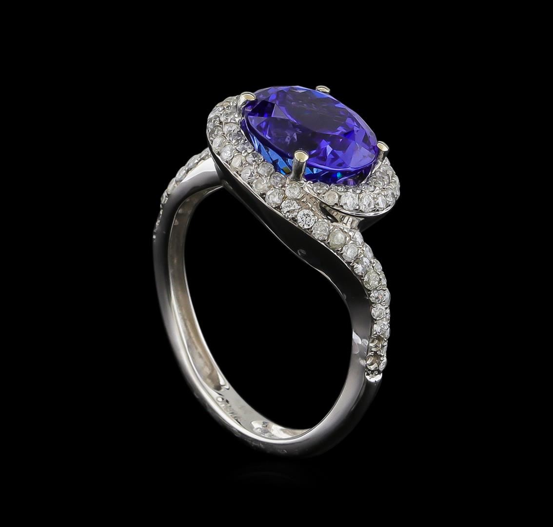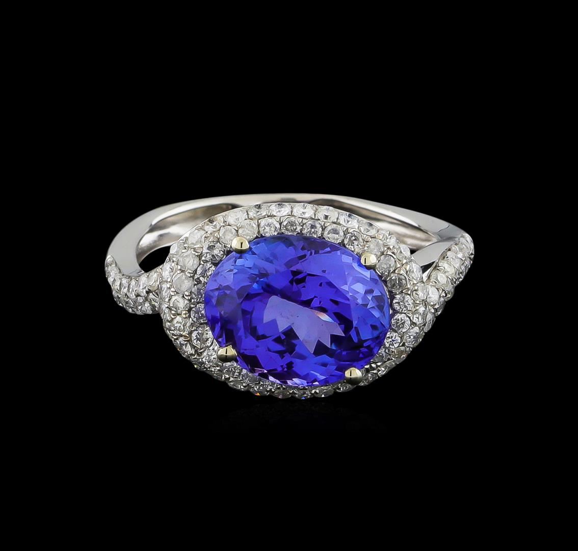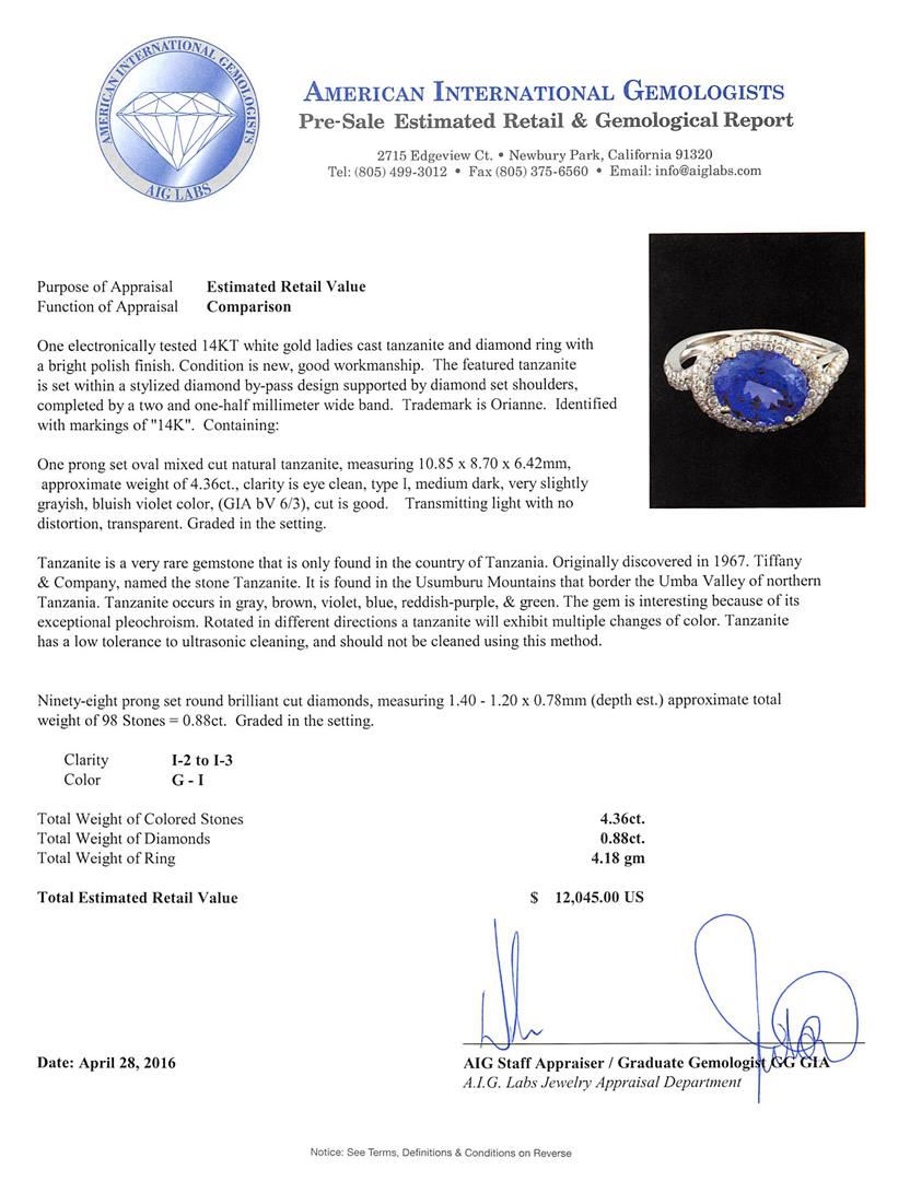 One electronically tested 14KT white gold ladies cast tanzanite and diamond ring with a bright polish finish. The featured tanzanite is set within a stylized diamond by-pass design supported by diamond set shoulders, completed by a two and one-half millimeter wide band. Trademark is Orianne. Identified with markings of "14K". Condition is new, good workmanship. Containing: One prong set oval mixed cut natural tanzanite, measuring 10.85 x 8.70 x 6.42mm, approximate weight of 4.36ct., clarity is eye clean, type I, medium dark, very slightly grayish, bluish violet color, (GIA bV 6/3), cut is good. Transmitting light with no distortion, transparent. Graded in the setting. Tanzanite is a very rare gemstone that is only found in the country of Tanzania. Originally discovered in 1967. Tiffany & Company, named the stone Tanzanite. It is found in the Usumburu Mountains that border the Umba Valley of northern Tanzania. Tanzanite occurs in gray, brown, violet, blue, reddish-purple, & green. The gem is interesting because of its exceptional pleochroism. Rotated in different directions a tanzanite will exhibit multiple changes of color. Tanzanite has a low tolerance to ultrasonic cleaning, and should not be cleaned using this method. Ninety-Eight prong set round brilliant cut diamonds, measuring 1.40 - 1.20 x 0.78mm (depth est.) approximate total weight of 98 Stones = 0.88ct. Graded in the setting. Clarity: I-2 to I-3. Color: G - I. Total Weight of Colored Stones 4.36ct. Total Weight of Diamonds 0.88ct. Total Weight of Ring 4.18gm. AIG Appraised at $12,045.00.