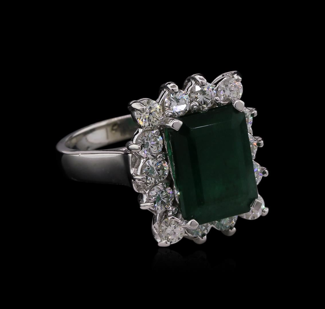 One electronically tested 14KT white gold lady's cast fashion ring with a basket halo with a bright polish finish. The featured lady's ring has a shank measuring 2.65 millimeters wide. Identified with markings of "14K". Condition is new, good workmanship. Containing: One prong set emerald standard step cut natural emerald, measuring 11.16 x 8.12 x 5.53mm, 20%. bulge factor, approximate weight of 4.36ct., clarity is heavily included, type III, dark, moderately strong, green color, (GIA G 7/4), cut is good. Naturally occurring internal & external characteristics are present. Indications of oil residue. Colored gemstones are presumed to have been subjected to commonly used enhancement processes. Graded in the setting. Fourteen prong set round brilliant cut diamonds, measuring 2.80 - 2.70 x 1.76mm (depth est.) approximate total weight of 14 Stones = 1.15ct. Graded in the setting. Clarity: VS-2 to SI-1 . Color: H - I. Cut Very Good. Total Weight of Colored Stones 4.36ct.. Total Weight of Diamonds 1.15ct.. Total Weight of Ring 6.60gm at $ 6900.00 GAS Appraised.
