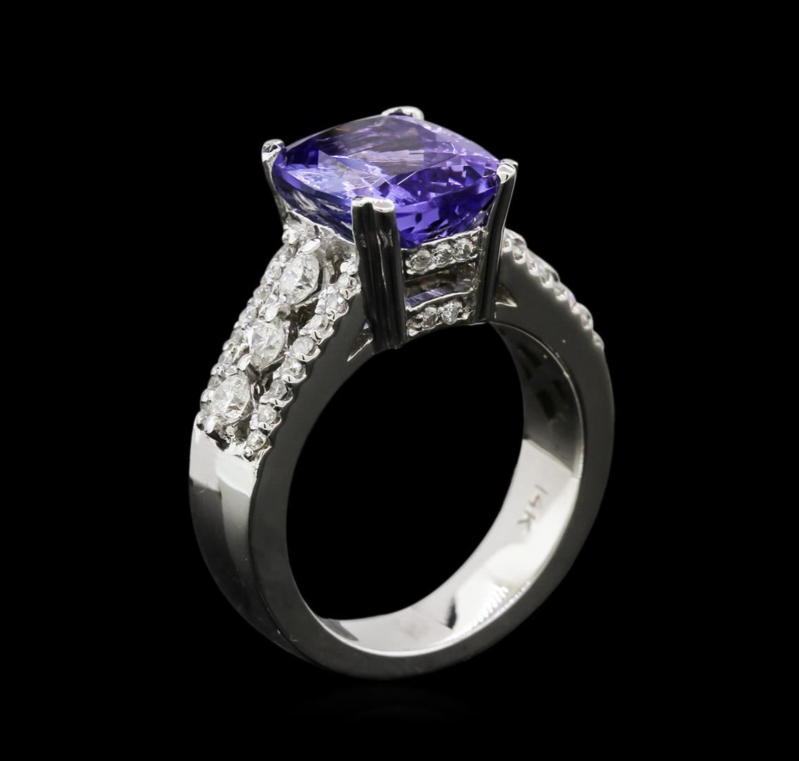 One electronically tested 14KT white gold lady's cast fashion ring with a cathedral shank with a bright polish finish. The featured lady's ring has a three row wide band shank measuring 4.79 millimeters wide. Identified with markings of "14K". Condition is new, good workmanship. Containing: One prong set rectangular modified brilliant cut natural tanzanite, measuring 10.84 x 8.85 x 5.53mm, approximate weight of 4.36ct., clarity is eye clean, type I, medium, very slightly grayish, bluish violet color, (GIA bV 5/3), cut is very good. Transmitting light with no distortion, transparent. Colored gemstones are presumed to have been subjected to commonly used enhancement processes. Graded in the setting. Six prong set round brilliant cut diamonds, measuring 2.60 - 2.55 x 1.60mm (depth est.) approximate total weight of 6 Stones = 0.39ct. Graded in the setting. Clarity: SI-1 to I-1. Color: G - Good Forty-Two prong set round brilliant cut diamonds, measuring 1.30 - 1.20 x 0.75mm (depth est.) approximate total weight of 42 Stones = 0.30ct. Graded in the setting. Clarity: SI-1 to I-1. Color: G - I. Cut Good. Total Weight of Colored Stones 4.36ct. Total Weight of Diamonds 0.69ct. Total Weight of Ring 10.10gm. GAS Appraised at $10,095.00.
