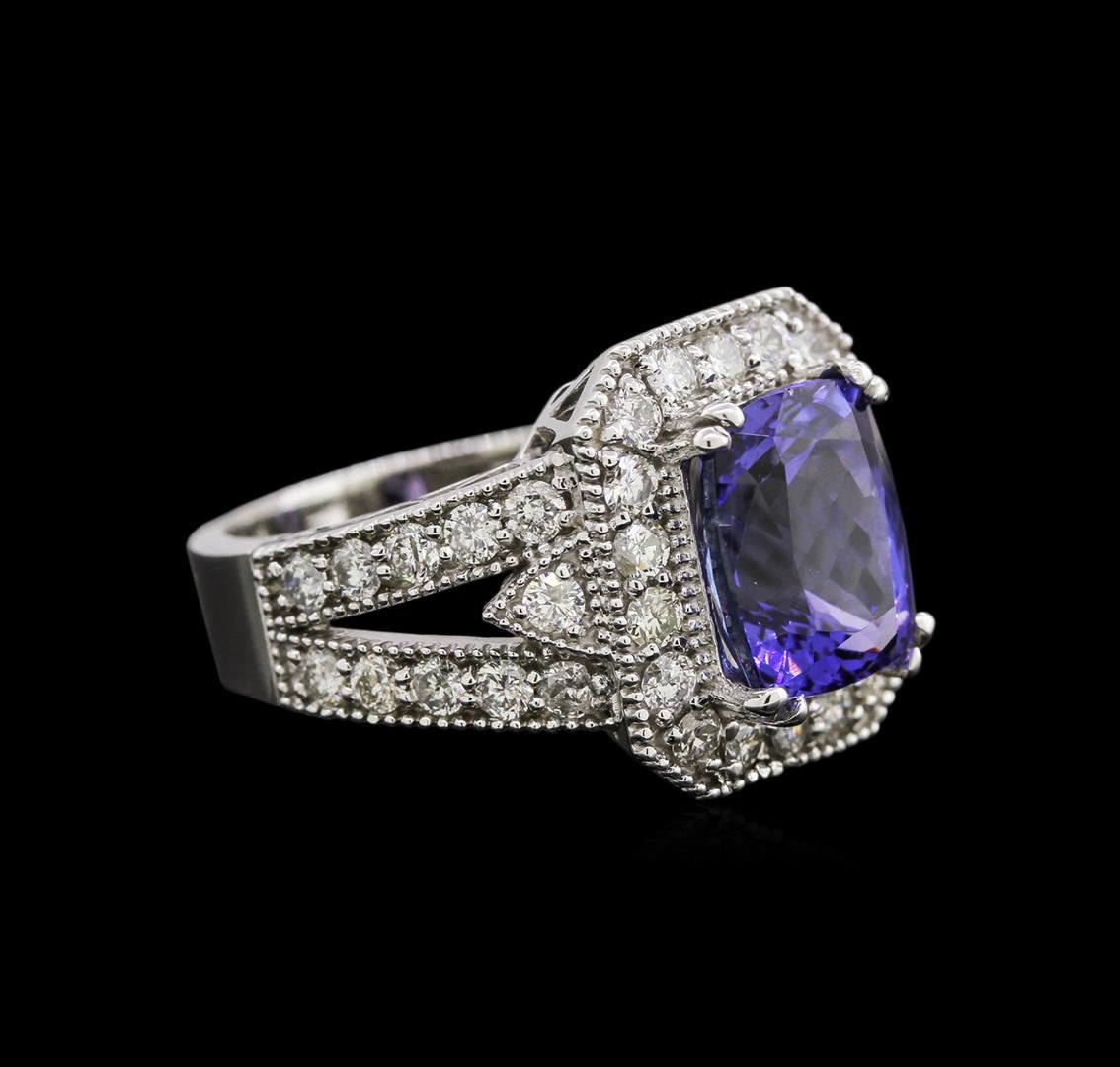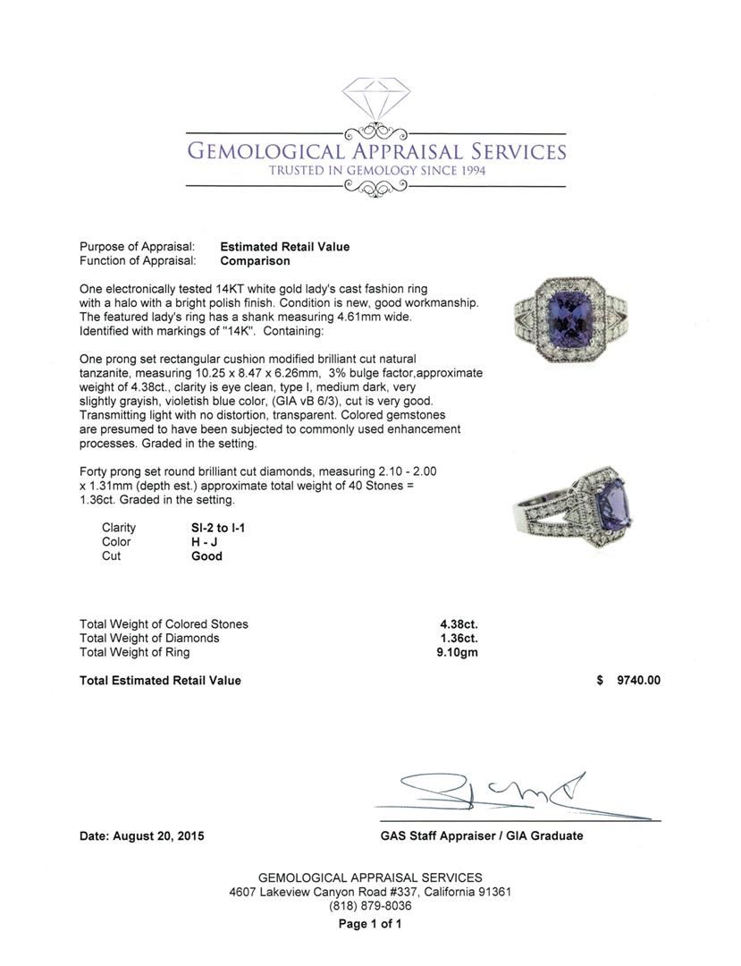 One electronically tested 14KT white gold lady's cast fashion ring with a halo with a bright polish finish. The featured lady's ring has a shank measuring 4.61mm wide. Identified with markings of "14K". Condition is new, good workmanship. Containing: One prong set rectangular cushion modified brilliant cut natural tanzanite, measuring 10.25 x 8.47 x 6.26mm, 3% bulge factor, approximate weight of 4.38ct., clarity is eye clean, type I, medium dark, very slightly grayish, violetish blue color, (GIA vB 6/3), cut is very good. Transmitting light with no distortion, transparent. Colored gemstones are presumed to have been subjected to commonly used enhancement processes. Graded in the setting. Forty prong set round brilliant cut diamonds, measuring 2.10 - 2.00 x 1.31mm (depth est.) approximate total weight of 40 Stones = 1.36ct. Graded in the setting. Clarity: SI-2 to I-1. Color: H - J. Cut Good. Total Weight of Colored Stones 4.38ct. Total Weight of Diamonds 1.36ct. Total Weight of Ring 9.10gm. GAS Appraised at $9,740.00.