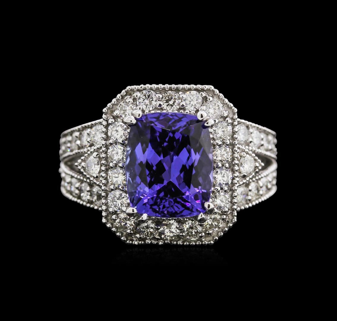 One electronically tested 14KT white gold lady's cast fashion ring with a halo with a bright polish finish. The featured lady's ring has a shank measuring 4.61mm wide. Identified with markings of "14K". Condition is new, good workmanship. Containing: One prong set rectangular cushion modified brilliant cut natural tanzanite, measuring 10.25 x 8.47 x 6.26mm, 3% bulge factor, approximate weight of 4.38ct., clarity is eye clean, type I, medium dark, very slightly grayish, violetish blue color, (GIA vB 6/3), cut is very good. Transmitting light with no distortion, transparent. Colored gemstones are presumed to have been subjected to commonly used enhancement processes. Graded in the setting. Forty prong set round brilliant cut diamonds, measuring 2.10 - 2.00 x 1.31mm (depth est.) approximate total weight of 40 Stones = 1.36ct. Graded in the setting. Clarity: SI-2 to I-1. Color: H - J. Cut Good. Total Weight of Colored Stones 4.38ct. Total Weight of Diamonds 1.36ct. Total Weight of Ring 9.10gm. GAS Appraised at $9,740.00.