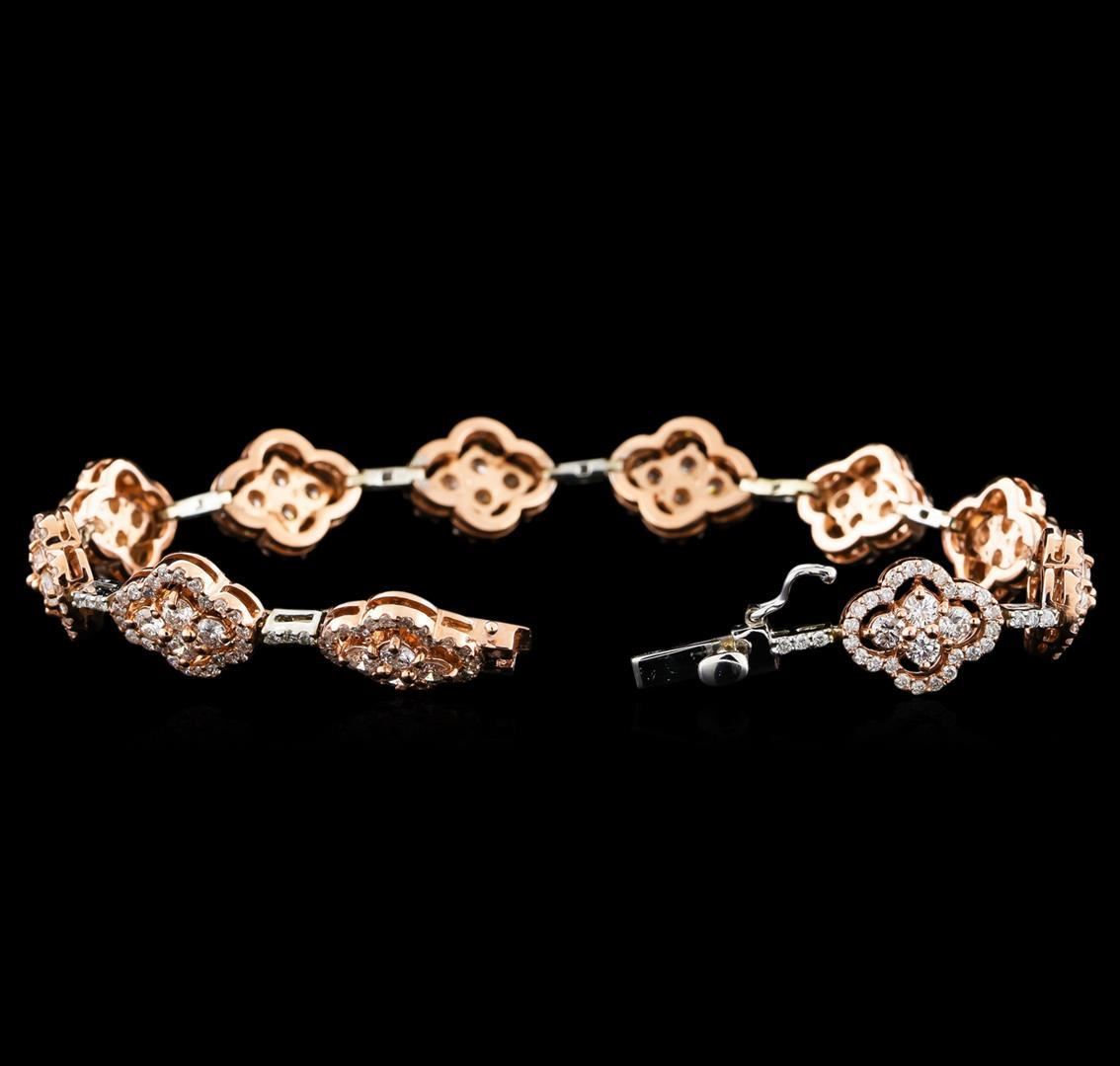 One electronically tested 14KT rose and white gold lady's combination cast & assembled fashion bracelet with a tongue clasp with foldover safety with a bright polish finish. The featured lady's bracelet measures 7 inches in length. Identified with markings of "K14". Condition is new, good workmanship. Containing: Forty-Four prong set round brilliant cut diamonds, measuring 2.50 - 2.40 x 1.52mm (depth est.) approximate total weight of 44 Stones = 2.49ct. Graded in the setting. Clarity: SI-1 to SI-2. Color: G - H. Cut Good Two Hundred Ninety-Seven prong set round brilliant cut diamonds, measuring 1.25 - 1.15 x 0.73mm (depth est.) approximate total weight of 297 Stones = 1.90 ct. Graded in the setting. Clarity: SI-1 to I-1. Color: G - Good. Total Weight of Diamonds 4.39ct. Total Weight of Bracelet 15.20gm GAS Appraised.