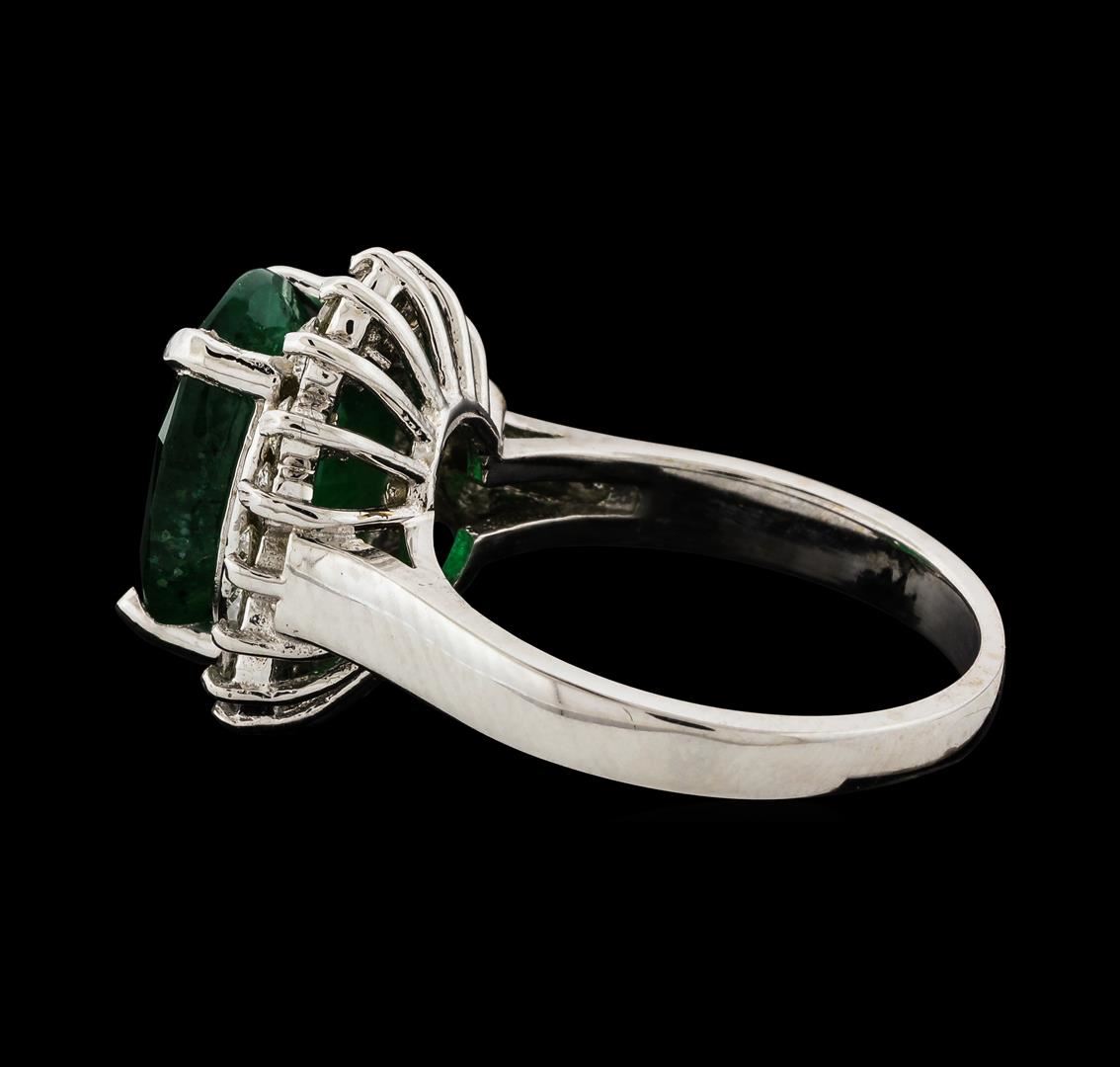 One electronically tested 14KT white gold lady's cast fashion ring with a basket halo with a bright polish finish. The featured lady's ring has a shank measuring 2.41 millimeters wide. Identified with markings of '14K'. Condition is new, good workmanship. Containing: One prong set oval modified mixed cut natural emerald, measuring 12.55 x 9.82 x 5.75mm, (depth est.) 8%. bulge factor, approximate weight of 4.39ct., clarity is heavily included, medium dark, moderately strong, green color, (GIA G 6/4), cut is good. Transmitting light somewhat diffusely, semi-transparent to translucent. No indications of clarity enhancement. Indications of oil residue. Colored gemstones are presumed to have been subjected to commonly used enhancement processes. Graded in the setting. Eighteen prong set round brilliant cut diamonds, measuring 2.00 - 1.90 x 1.21mm (depth est.) approximate total weight of 18 Stones = 0.50ct. Graded in the setting. Clarity SI-1 to SI-2. Color: G - H Cut Good. Total Weight of Colored Stones 4.39ct.. Total Weight of Diamonds 0.50ct.. Total Weight of Ring 6.40gm GAS Appraised at $5,840.00.