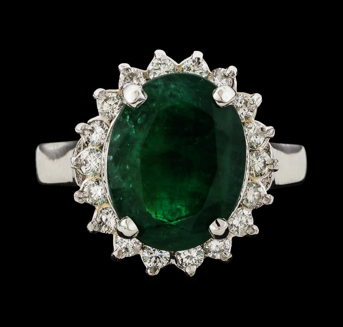 One electronically tested 14KT white gold lady's cast fashion ring with a basket halo with a bright polish finish. The featured lady's ring has a shank measuring 2.41 millimeters wide. Identified with markings of '14K'. Condition is new, good workmanship. Containing: One prong set oval modified mixed cut natural emerald, measuring 12.55 x 9.82 x 5.75mm, (depth est.) 8%. bulge factor, approximate weight of 4.39ct., clarity is heavily included, medium dark, moderately strong, green color, (GIA G 6/4), cut is good. Transmitting light somewhat diffusely, semi-transparent to translucent. No indications of clarity enhancement. Indications of oil residue. Colored gemstones are presumed to have been subjected to commonly used enhancement processes. Graded in the setting. Eighteen prong set round brilliant cut diamonds, measuring 2.00 - 1.90 x 1.21mm (depth est.) approximate total weight of 18 Stones = 0.50ct. Graded in the setting. Clarity SI-1 to SI-2. Color: G - H Cut Good. Total Weight of Colored Stones 4.39ct.. Total Weight of Diamonds 0.50ct.. Total Weight of Ring 6.40gm GAS Appraised at $5,840.00.