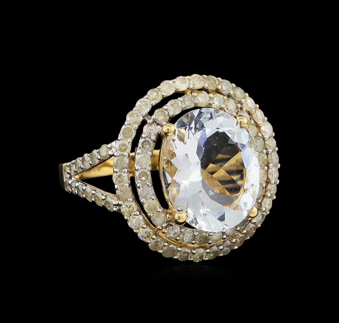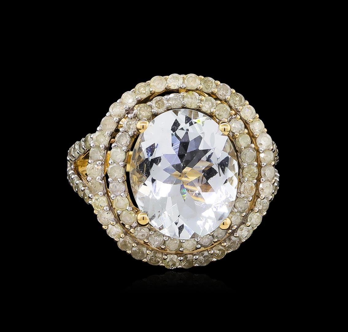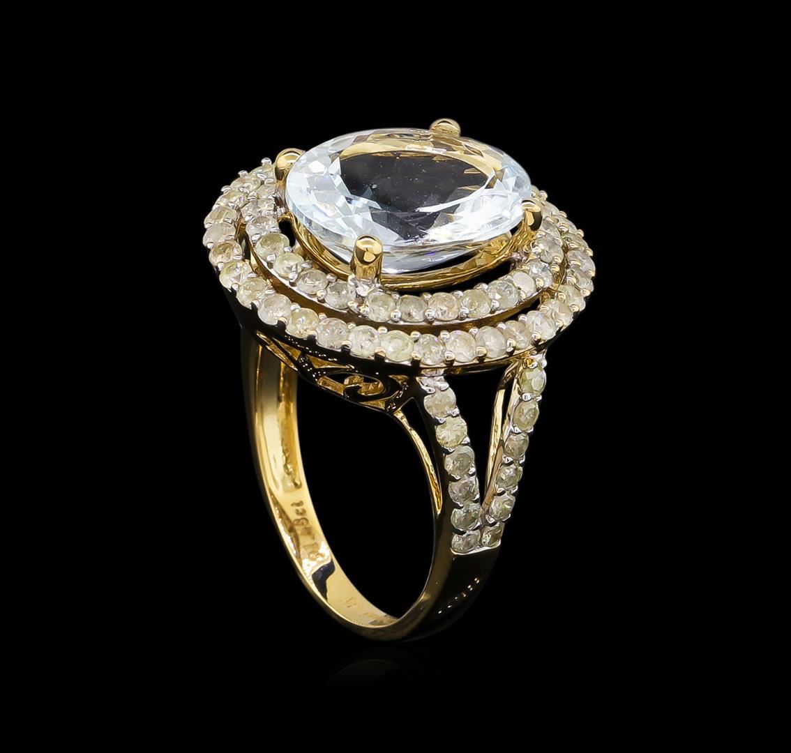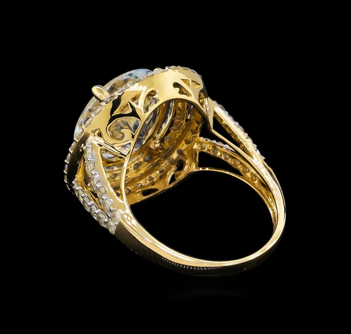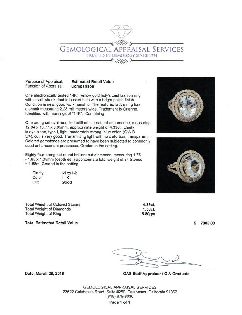 One electronically tested 14KT yellow gold lady's cast fashion ring with a split shank double basket halo with a bright polish finish. The featured lady's ring has a shank measuring 2.28 millimeters wide. Trademark is Orianne. Identified with markings of "14K". Condition is new, good workmanship. Containing: One prong set oval modified brilliant cut natural aquamarine, measuring 12.94 x 10.77 x 5.95mm, approximate weight of 4.39ct., clarity is eye clean, type I, light, moderately strong, blue color, (GIA B 3/4), cut is very good. Transmitting light with no distortion, transparent. Colored gemstones are presumed to have been subjected to commonly used enhancement processes. Graded in the setting. Eighty-Four prong set round brilliant cut diamonds, measuring 1.75 - 1.65 x 1.05mm (depth est.) approximate total weight of 84 Stones = 1.58ct. Graded in the setting. Clarity: I-1 to I-2. Color: I - Good. Total Weight of Colored Stones 4.39ct. Total Weight of Diamonds 1.58ct. Total Weight of Ring 5.80gm. GAS Appraised at $7,805.00.