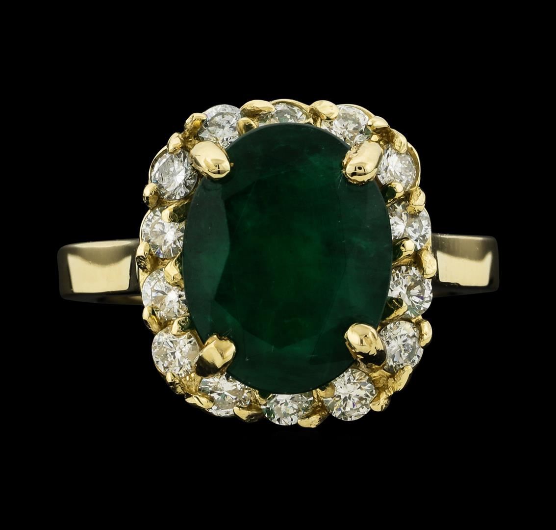One electronically tested 14KT yellow gold lady's cast fashion ring with a cathedral shank with a basket halo with a bright polish finish. The featured lady's ring has a shank measuring 2.15 millimeters wide. Identified with markings of '14K'. Condition is new, good workmanship. Containing: One prong set oval modified mixed cut natural emerald, measuring 12.10 x 9.35 x 6.22mm, (depth est.) 10%. bulge factor, approximate weight of 4.40ct., clarity is heavily included, medium dark, moderately strong, green color, (GIA G 6/4), cut is good. Transmitting light somewhat diffusely, semi-transparent to translucent. Indications of oil residue. Naturally occurring internal & external characteristics are present. Colored gemstones are presumed to have been subjected to commonly used enhancement processes. Graded in the setting. Fourteen prong set round brilliant cut diamonds, measuring 2.40 - 2.30 x 1.46mm (depth est.) approximate total weight of 14 Stones = 0.70ct. Graded in the setting. Clarity SI-1 to SI-3. Color: H - I Cut Good. Total Weight of Colored Stones 4.40ct.. Total Weight of Diamonds 0.70ct.. Total Weight of Ring 6.30gm. GAS Appraised at $4,790.00.
