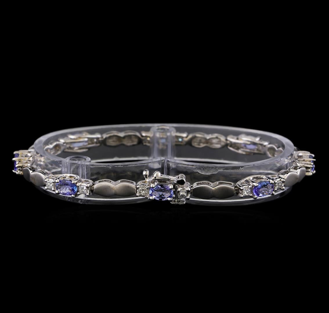 One 14K white gold bracelet 7 inches. 15.52 GR. Containing: Main gemstones: Identity: Tanzanite. Carat weight: 4.40 CTS TW. 8 PCS. Shape and measurement: Oval shape. Quality: Good medium color. Adjacent gemstones: Identity: natural diamond. Shape: Princess cut diamonds. 16 PCS. Carat weight: 1.50 CTS TW. Quality: SI clarity, G-H color. All fine cutting and proportions. Total gemstones weight: 5.90 CTS TW. RBGS Appraised at $5,600.00.