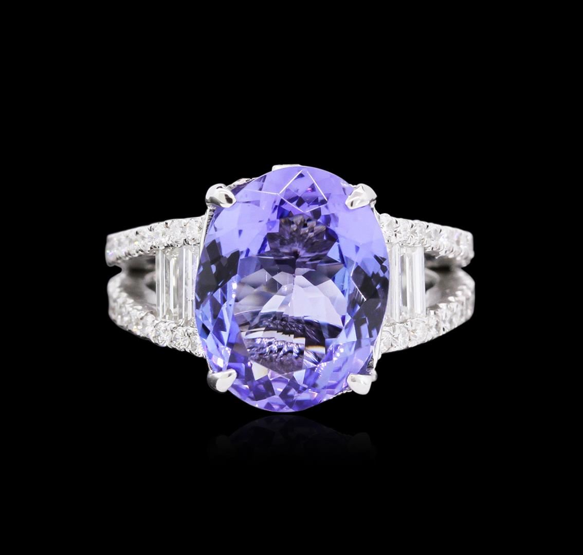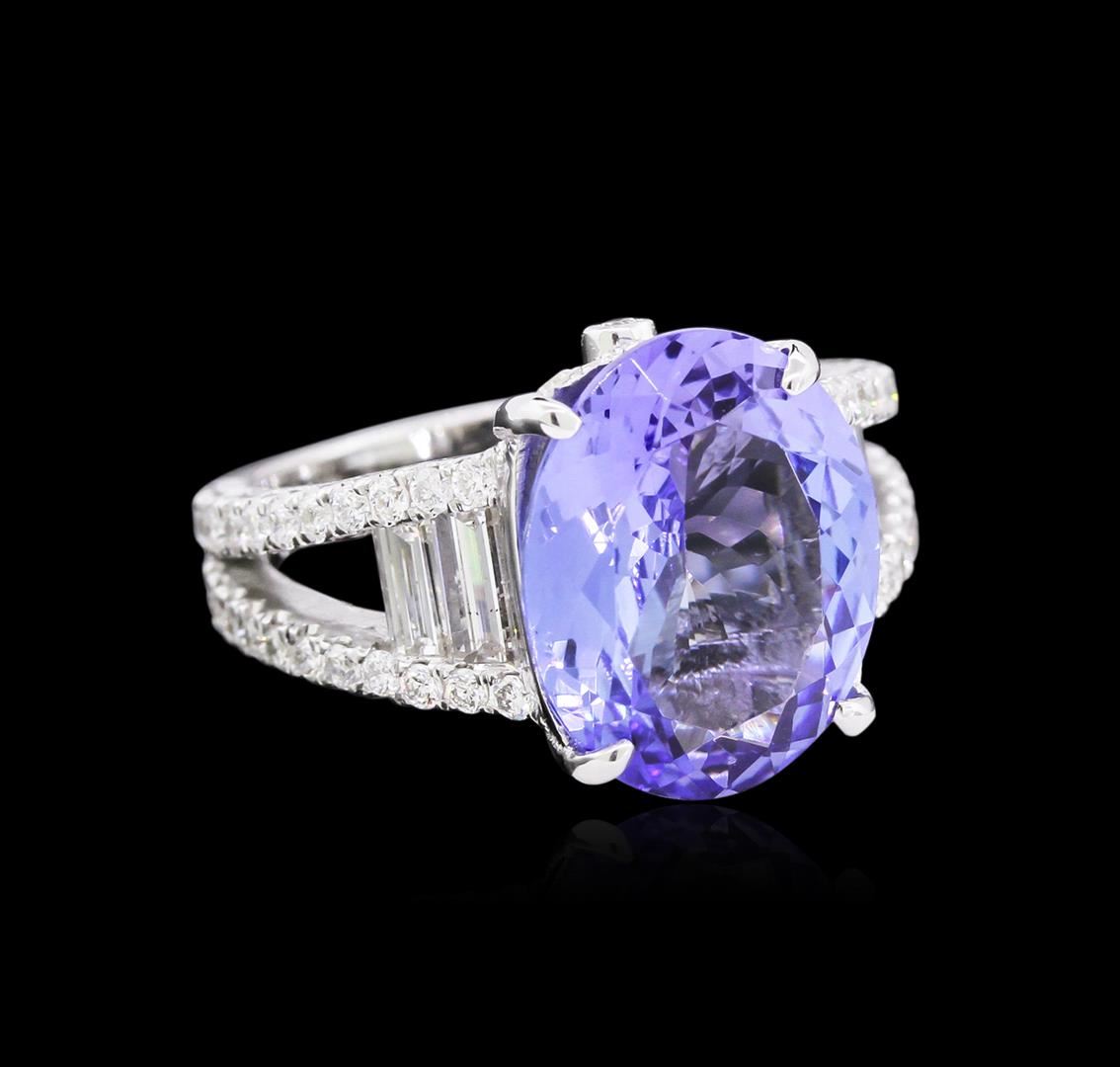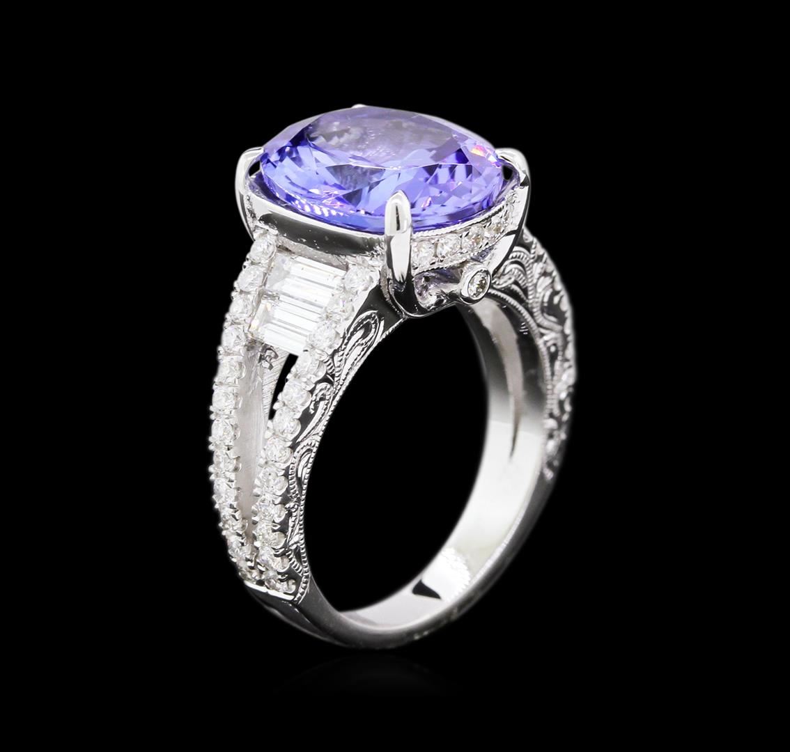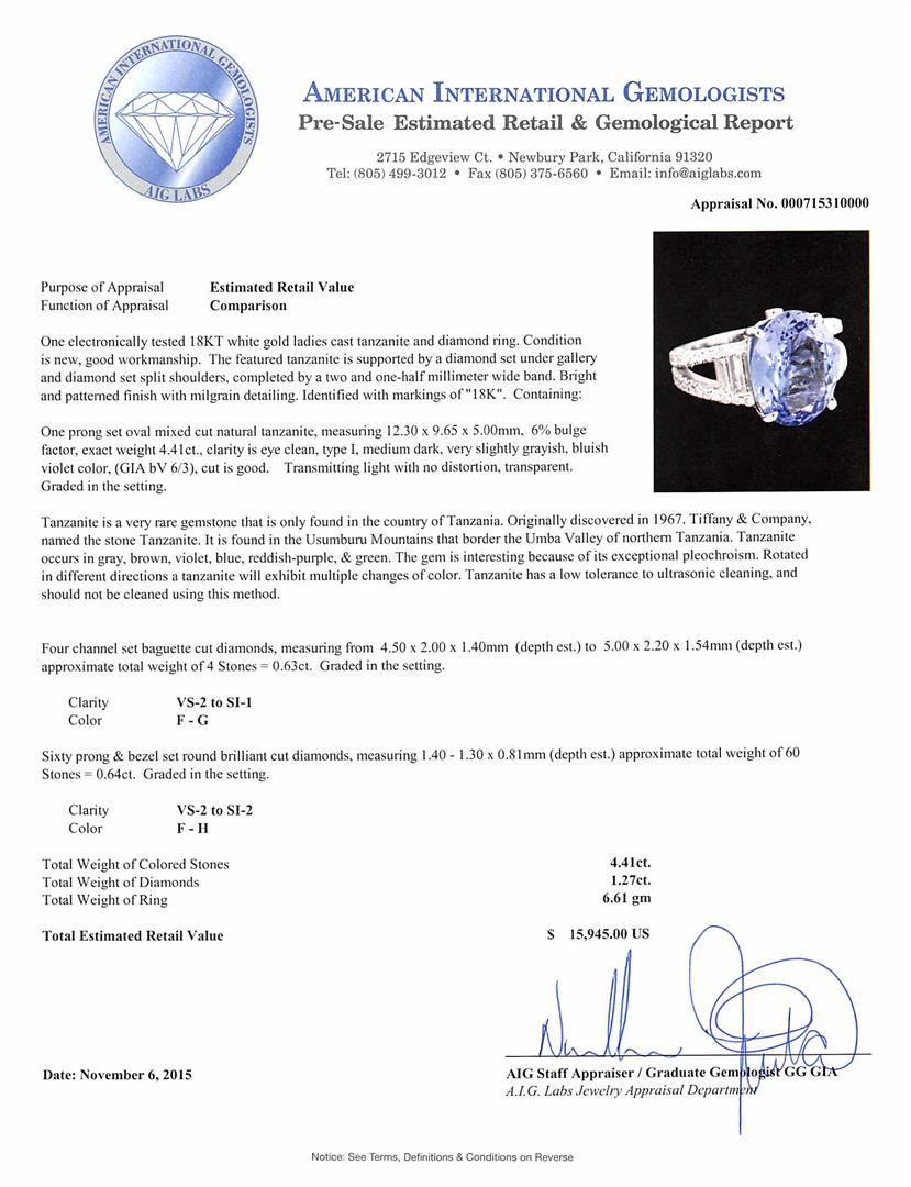 One electronically tested 18KT white gold ladies cast tanzanite and diamond ring. The featured tanzanite is supported by a diamond set under gallery and diamond set split shoulders, completed by a two and one-half millimeter wide band. Bright and patterned finish with milgrain detailing. Identified with markings of "18K". Condition is new, good workmanship. Containing: One prong set oval mixed cut natural tanzanite, measuring 12.30 x 9.65 x 5.00mm, 6% bulge factor, exact weight 4.41ct., clarity is eye clean, type I, medium dark, very slightly grayish, bluish violet color, (GIA bV 6/3), cut is good. Transmitting light with no distortion, transparent. Graded in the setting. Tanzanite is a very rare gemstone that is only found in the country of Tanzania. Originally discovered in 1967. Tiffany & Company, named the stone Tanzanite. It is found in the Usumburu Mountains that border the Umba Valley of northern Tanzania. Tanzanite occurs in gray, brown, violet, blue, reddish-purple, & green. The gem is interesting because of its exceptional pleochroism. Rotated in different directions a tanzanite will exhibit multiple changes of color. Tanzanite has a low tolerance to ultrasonic cleaning, and should not be cleaned using this method. Four channel set baguette cut diamonds, measuring from 4.50 x 2.00 x 1.40mm (depth est.) to 5.00 x 2.20 x 1.54mm (depth est.) approximate total weight of 4 Stones = 0.63ct. Graded in the setting. Clarity: VS-2 to SI-1. Color: F - G Sixty prong & bezel set round brilliant cut diamonds, measuring 1.40 - 1.30 x 0.81mm (depth est.) approximate total weight of 60 Stones = 0.64ct. Graded in the setting. Clarity: VS-2 to SI-2. Color: F - H. Total Weight of Colored Stones 4.41ct. Total Weight of Diamonds 1.27ct. Total Weight of Ring 6.61gm. AIG Appraised at $15,945.00.