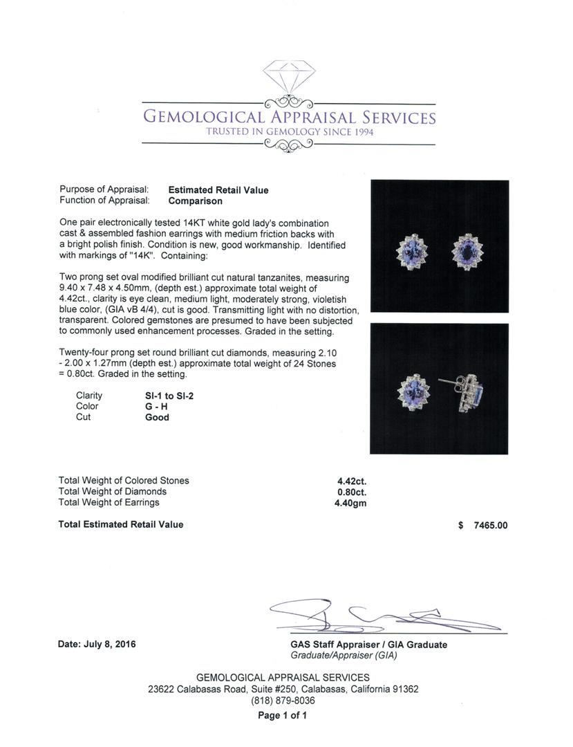 One pair electronically tested 14KT white gold lady's combination cast & assembled fashion earrings with medium friction backs with a bright polish finish. Identified with markings of "14K". Condition is new, good workmanship. Containing: Two prong set oval modified brilliant cut natural tanzanites, measuring 9.40 x 7.48 x 4.50mm, (depth est.) approximate total weight of 4.42ct., clarity is eye clean, medium light, moderately strong, violetish blue color, (GIA vB 4/4), cut is good. Transmitting light with no distortion, transparent. Colored gemstones are presumed to have been subjected to commonly used enhancement processes. Graded in the setting. Twenty-Four prong set round brilliant cut diamonds, measuring 2.10 - 2.00 x 1.27mm (depth est.) approximate total weight of 24 Stones = 0.80ct. Graded in the setting. Clarity: SI-1 to SI-2. Color: G - Good. Total Weight of Colored Stones 4.42ct. Total Weight of Diamonds 0.80ct. Total Weight of Earrings 4.40gm. GAS Appraised at $7,465.00.