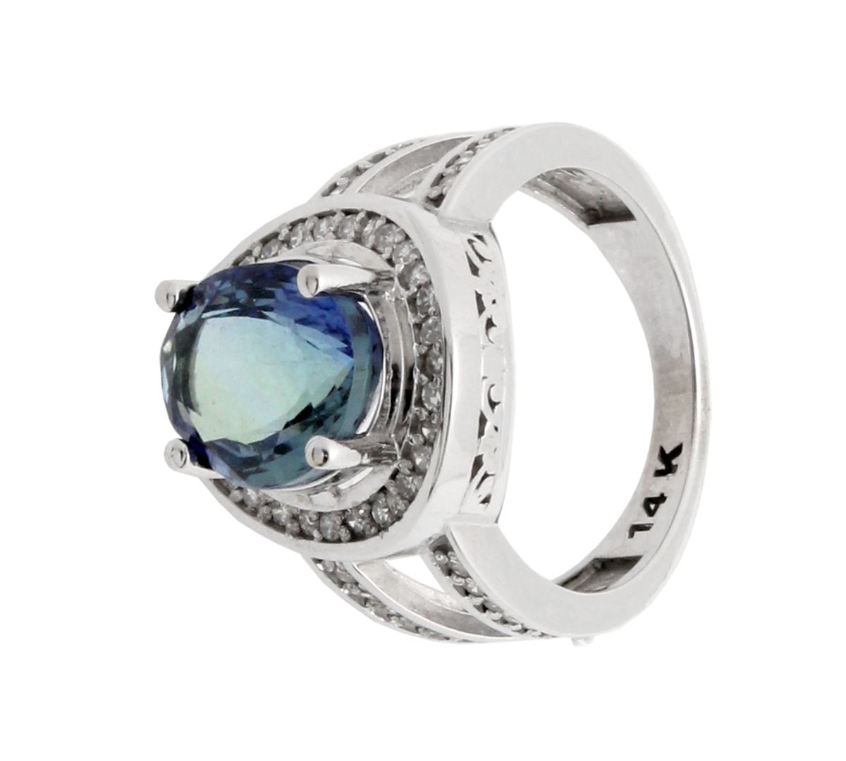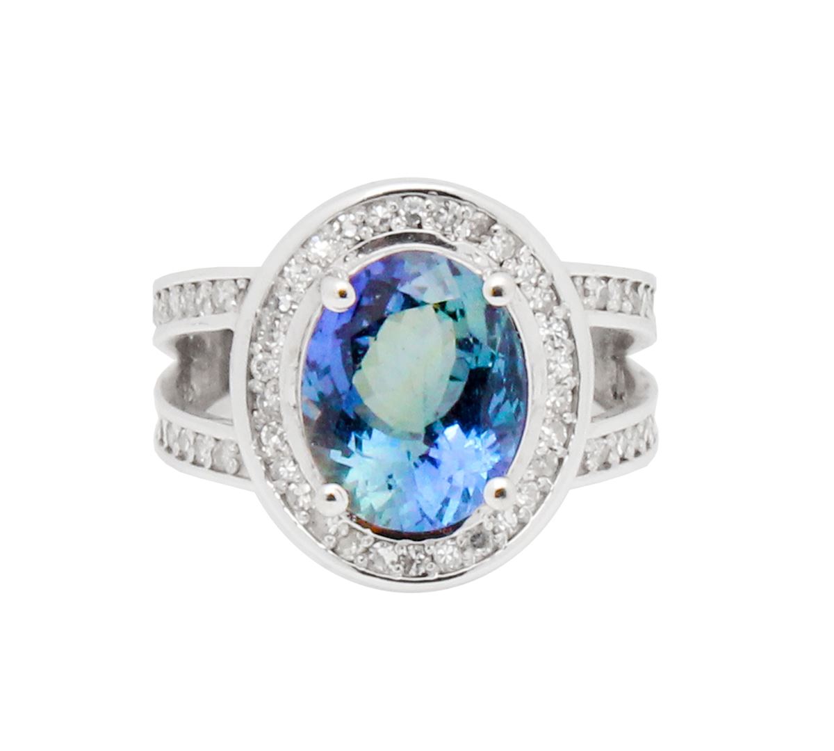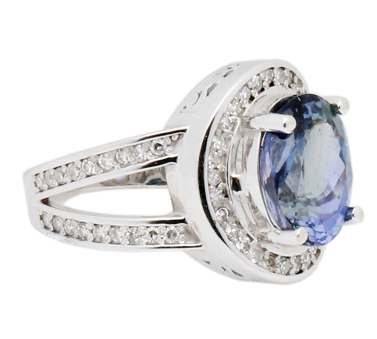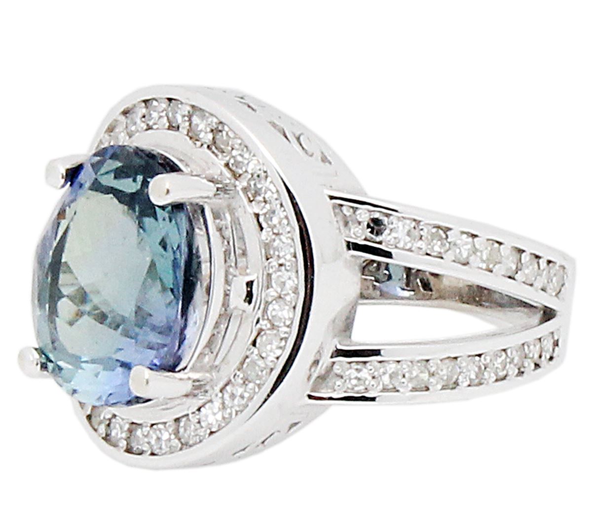 One electronically tested 14KT white gold ladies cast tanzanite & diamond ring with a bright finish. The featured tanzanite is set within a diamond bezel, supported by an elaborate white gold under gallery and diamond set shoulders, completed by a three millimeter wide band. Identified with markings of "14K". Condition is pre-owned, great workmanship. Containing: One prong set oval brilliant cut natural tanzanite, measuring 11.27 x 8.93 x 5.99mm, exact weight 4.43ct., clarity is eye clean, type I, medium dark, moderately strong, Bluish Violet color, brilliant cut. Transmitting light with no distortion, transparent. Graded loose prior to setting in the GIA Laboratory, Report # 6175016161. The report is attached. Tanzanite occurs in gray, brown, violet, blue, reddish-purple, & green. The gem is interesting because of its exceptional pleochroism. Rotated in different directions a tanzanite will exhibit multiple changes of color. Tanzanite has a low tolerance to ultrasonic cleaning, and should not be cleaned using this method. Sixty-six prong set round brilliant cut diamonds, measuring .08mm approximate total weight of 66 Stones = 0.53ct. Graded in the setting. Clarity: VS-VVS. Color: G-H. Total Weight of Colored Stones 4.43ct. Total Weight of Diamonds 0.53ct. Total Weight of Ring 7.19 grams. IGL Appraised at $18,400.00. IGL Appraised at $18,400.00.