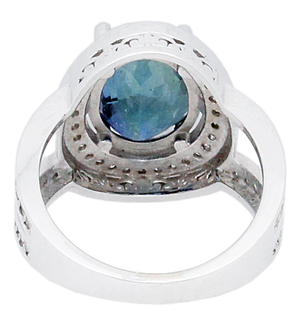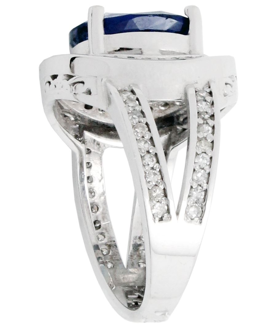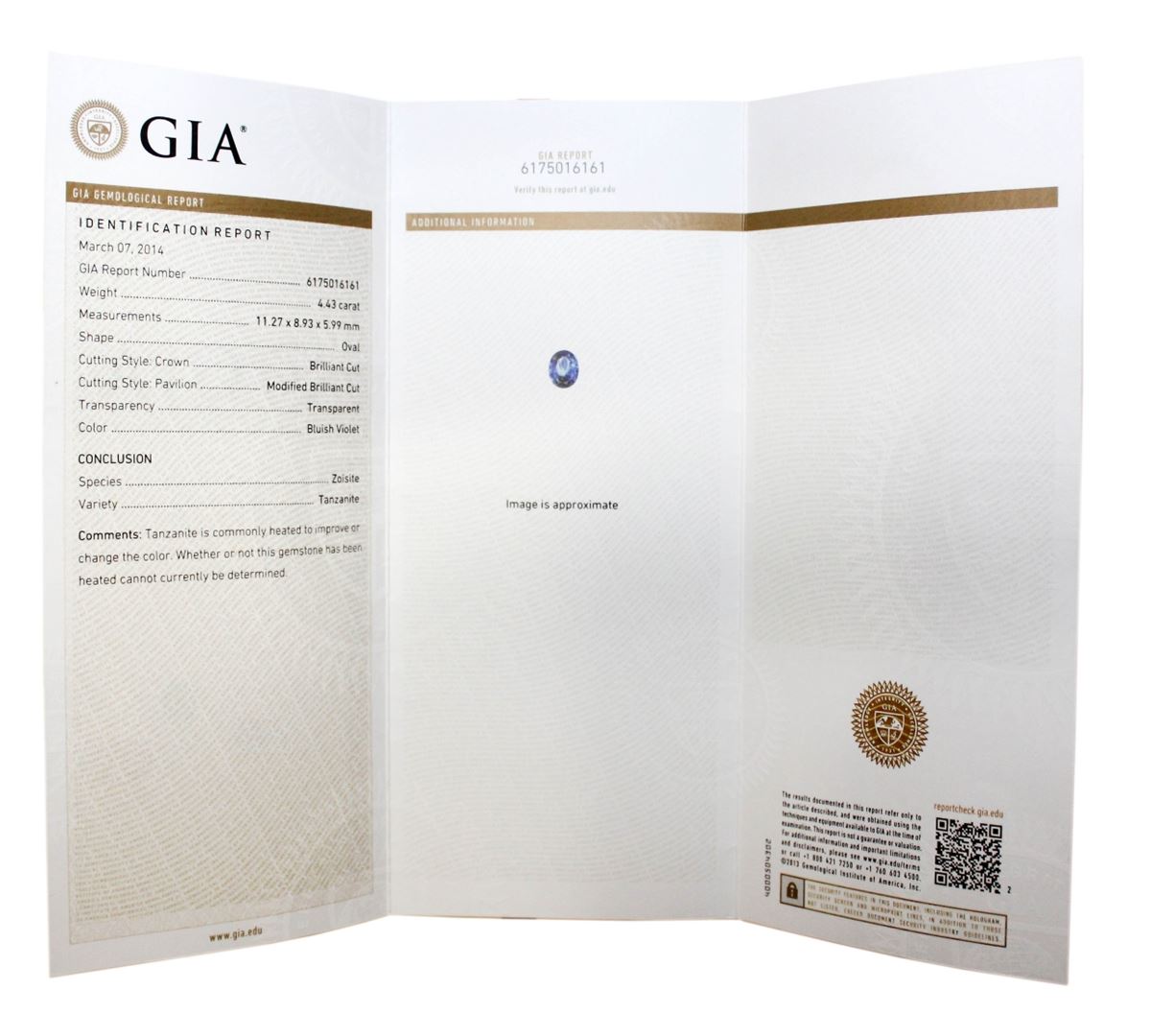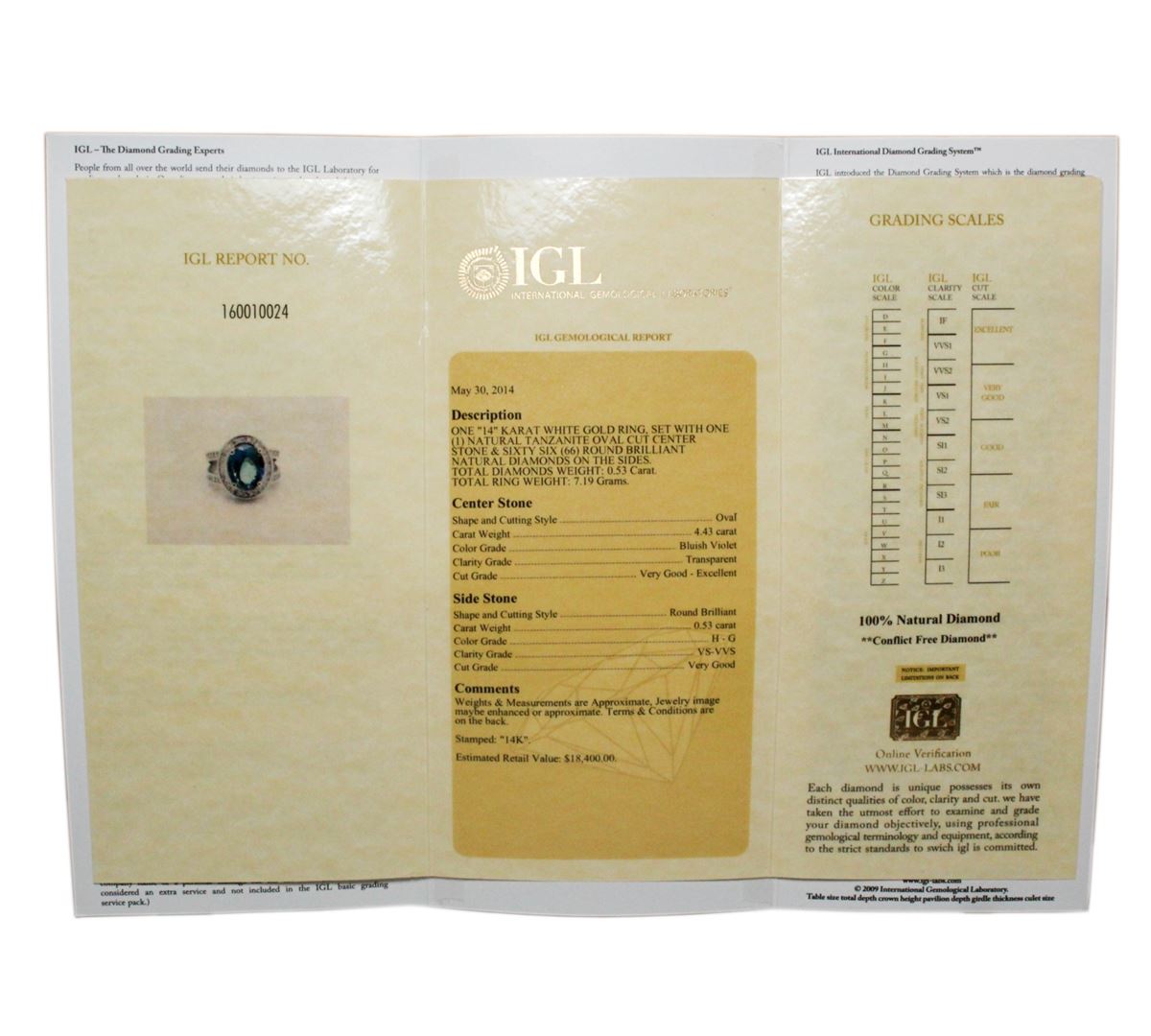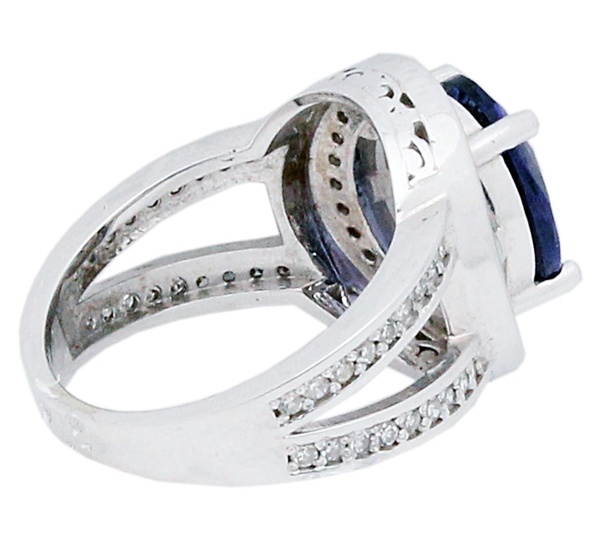 One electronically tested 14KT white gold ladies cast tanzanite & diamond ring with a bright finish. The featured tanzanite is set within a diamond bezel, supported by an elaborate white gold under gallery and diamond set shoulders, completed by a three millimeter wide band. Identified with markings of "14K". Condition is pre-owned, great workmanship. Containing: One prong set oval brilliant cut natural tanzanite, measuring 11.27 x 8.93 x 5.99mm, exact weight 4.43ct., clarity is eye clean, type I, medium dark, moderately strong, Bluish Violet color, brilliant cut. Transmitting light with no distortion, transparent. Graded loose prior to setting in the GIA Laboratory, Report # 6175016161. The report is attached. Tanzanite occurs in gray, brown, violet, blue, reddish-purple, & green. The gem is interesting because of its exceptional pleochroism. Rotated in different directions a tanzanite will exhibit multiple changes of color. Tanzanite has a low tolerance to ultrasonic cleaning, and should not be cleaned using this method. Sixty-six prong set round brilliant cut diamonds, measuring .08mm approximate total weight of 66 Stones = 0.53ct. Graded in the setting. Clarity: VS-VVS. Color: G-H. Total Weight of Colored Stones 4.43ct. Total Weight of Diamonds 0.53ct. Total Weight of Ring 7.19 grams. IGL Appraised at $18,400.00. IGL Appraised at $18,400.00.