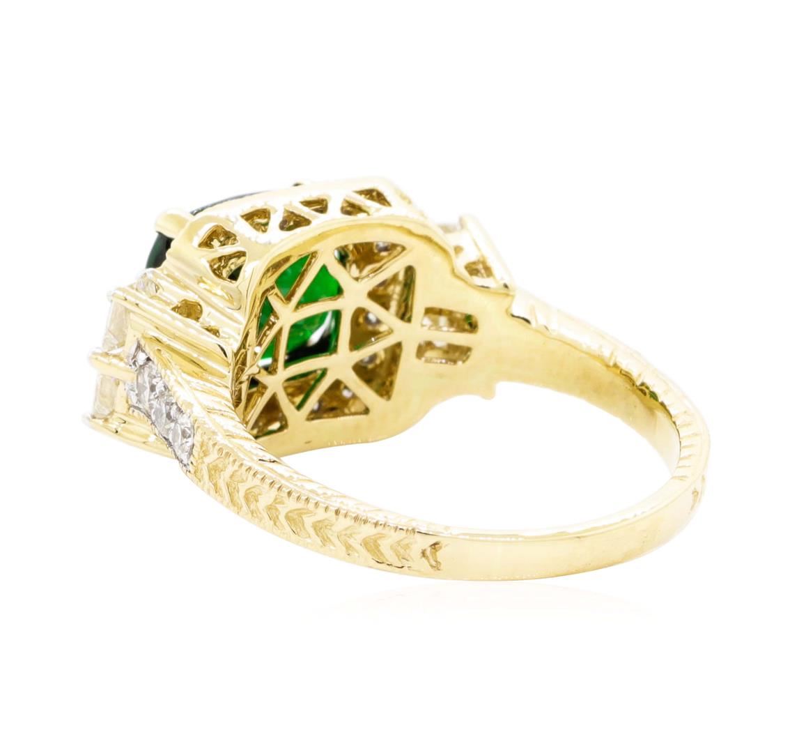 One electronically tested 14KT yellow gold lady's cast fashion ring with a cathedral shank with a bright polish with milgrain detailing finish. The featured lady's ring has hand engraved detailing and a shank measuring 1.98 millimeters wide. Identified with markings of '14K'. Condition is new, good workmanship. Containing: One prong set rectangular cushion modified mixed cut natural tsavorite garnet, measuring 9.20 x 7.63 x 5.93mm, (depth est.) approximate weight of 3.54ct., clarity is eye clean, medium dark, strong, green color, (GIA G 6/5), cut is very good. Transmitting light with no distortion, transparent. Colored gemstones are presumed to have been subjected to commonly used enhancement processes. Graded in the setting. Four prong set princess cut diamonds, measuring 2.80 x 2.70 x 2.03mm (depth est.) approximate total weight of 4 Stones = 0.50ct. Graded in the setting. Color H - I Clarity VS-1 to VS-2 Cut Very Good Six prong set round brilliant cut diamonds, measuring 2.00 - 1.90 x 1.21mm (depth est.) approximate total weight of 6 Stones = 0.18ct. Graded in the setting. Color H - I Clarity SI-1 to SI-2 Cut Good Twenty prong set round brilliant cut diamonds, measuring 1.50 - 1.40 x 0.87mm (depth est.) approximate total weight of 20 Stones = 0.22ct. Graded in the setting. Color H - I Clarity SI-1 to SI-2 Cut Good. Total Weight of Colored Stones 3.54ct.. Total Weight of Diamonds 0.90ct.. Total Weight of Ring 5.80gm GAS Appraised at $23150.00. GAS Appraised.